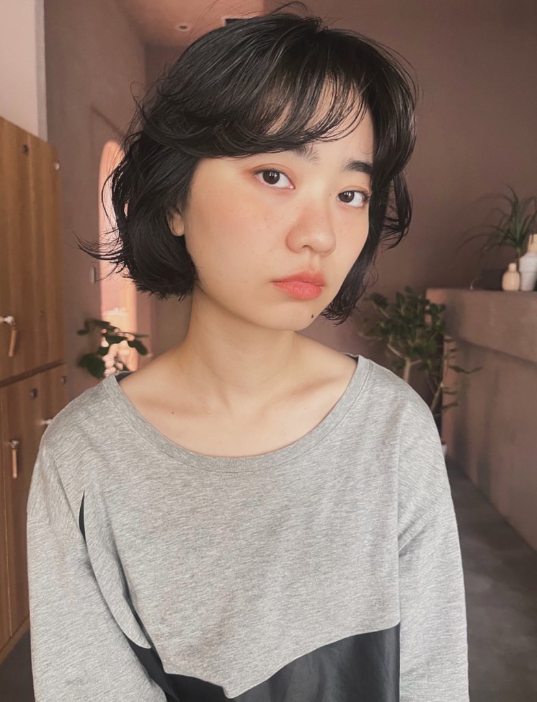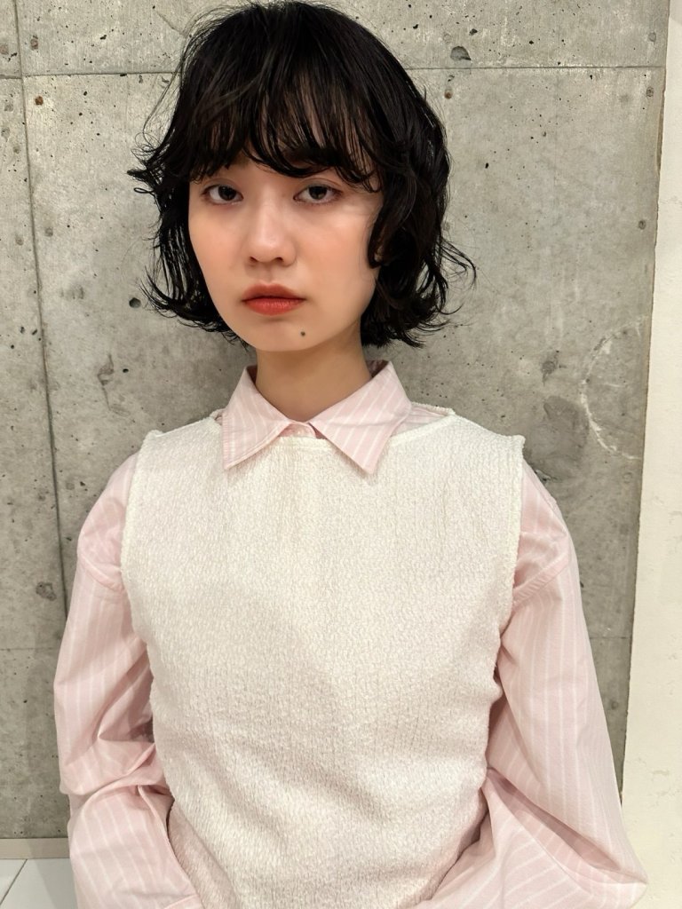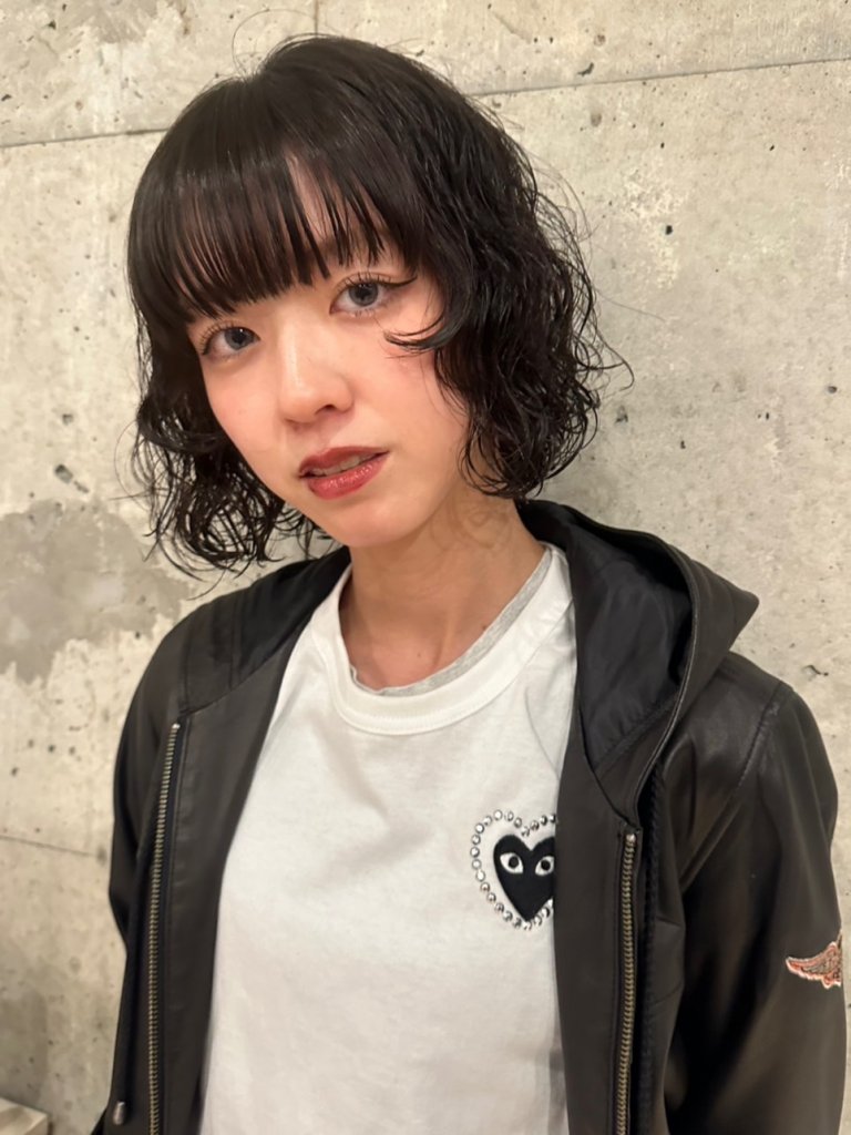 細かめのパーマが黒髪ボブには相性◎。細かいパーマがぷりんとするようムースで仕上げるのがおすすめ!