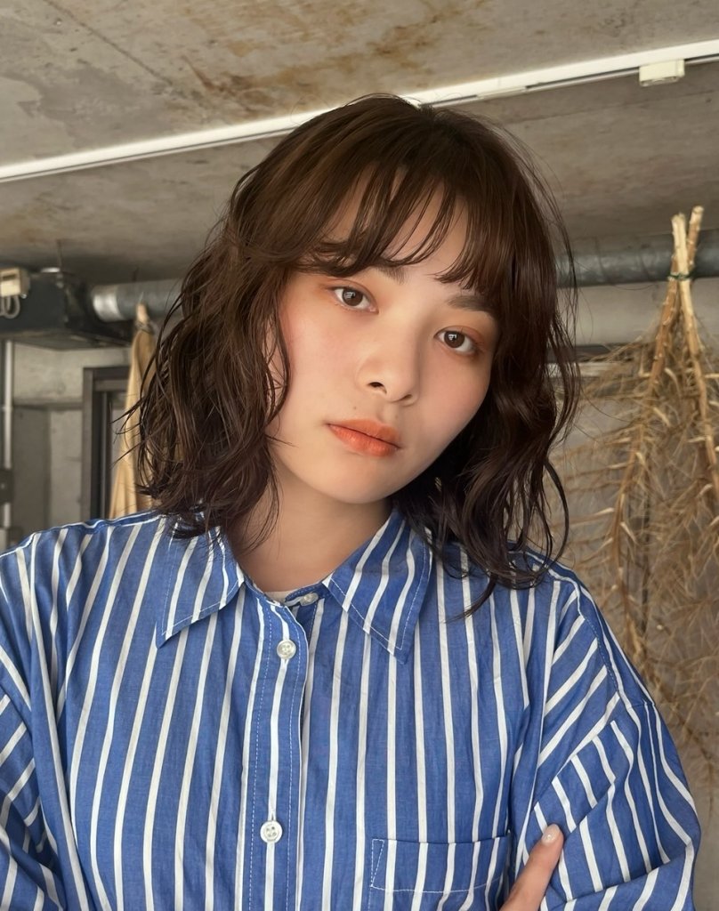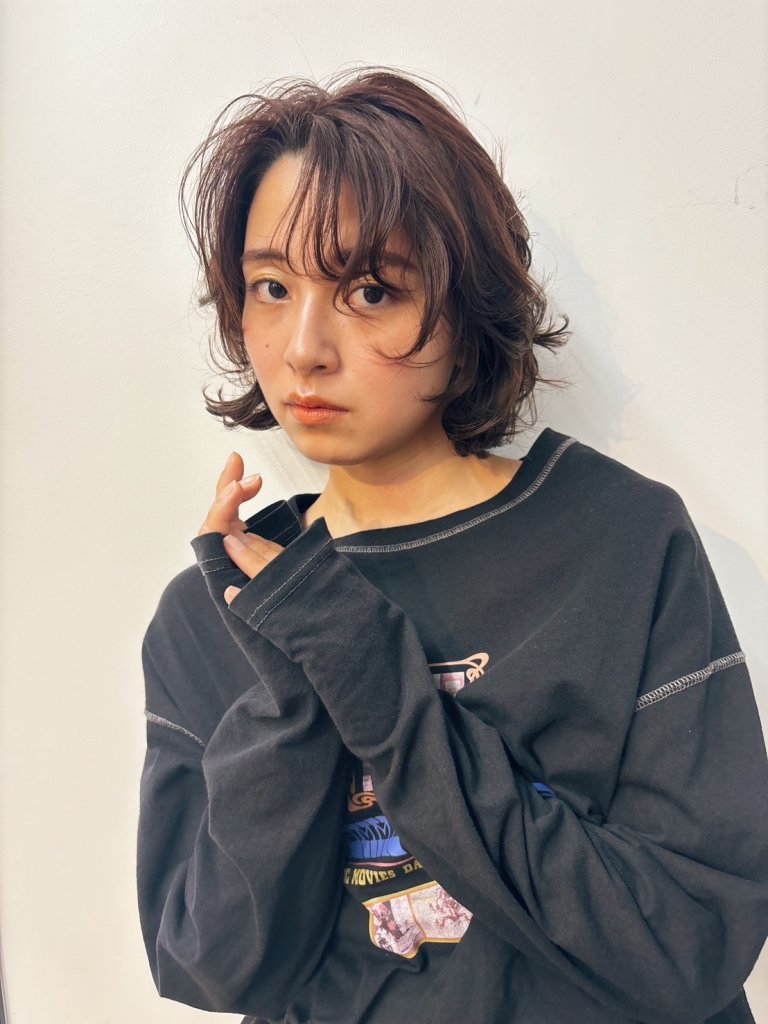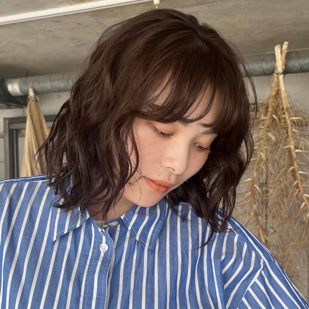 前髪に巻きすぎないパーマをかけて抜け感を出したスタイル。顔まわりに隙間を作り、前髪も立ち上げることでより垢抜けて見えるところがポイント!