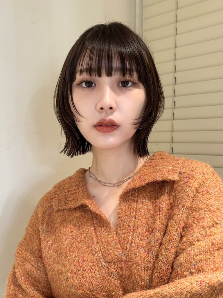 パツッとラインでシャープさを残しつつ、フルバングで甘すぎないバランスがコツ。シンプルだけど目を惹くボブスタイルです。