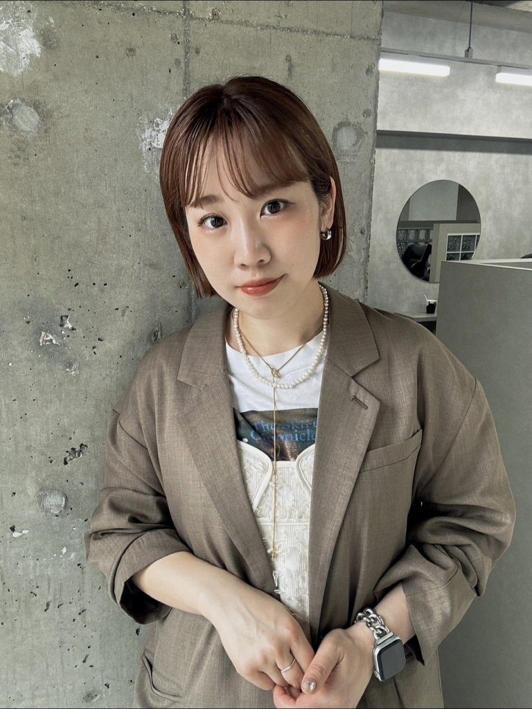 顔周りにレイヤーを入れて、いつものボブにちょっとした変化を。顔周りはワンカールで内巻きにすることで、動きが出て一気にこなれ感アップします。