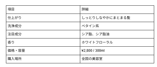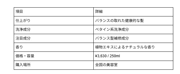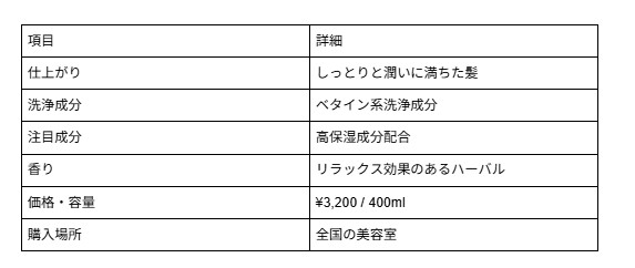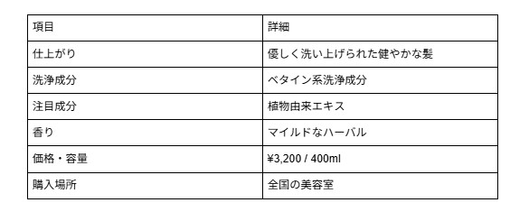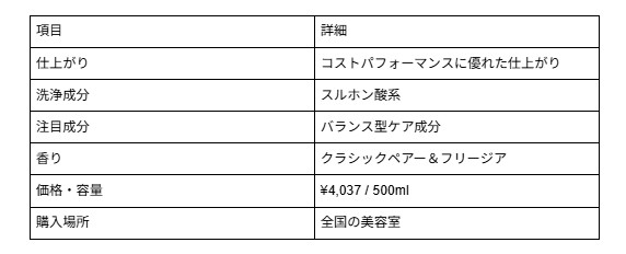 「頭皮・毛髪を元の状態の弱酸性に近づけるような処方があり、うるおいを与えてしっとりとした手触り、柔らかさがでる印象です。香りもスイートサボンで優しい香りなので嫌いな人はあまりいないと思います。」