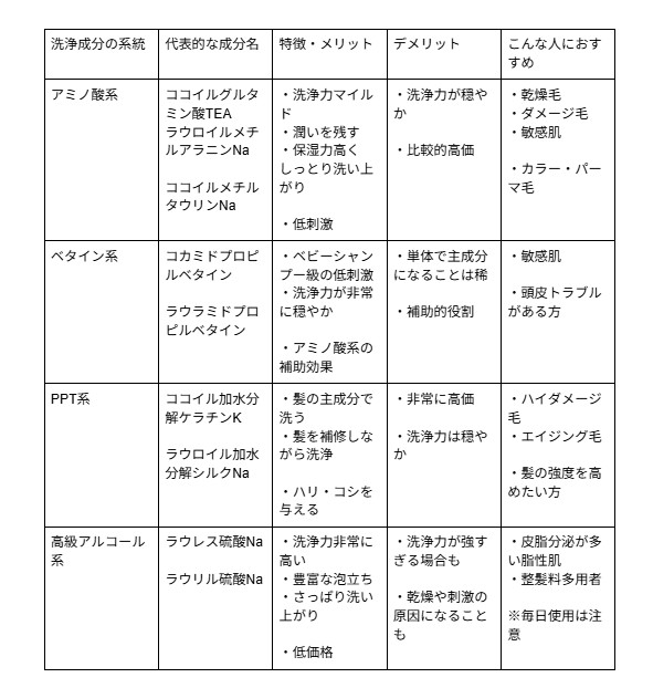 シャンプーの品質を最も左右するのが「洗浄成分(界面活性剤)」です。プロはまず、全成分表示の最初から3番目までに記載されている成分をチェックします。