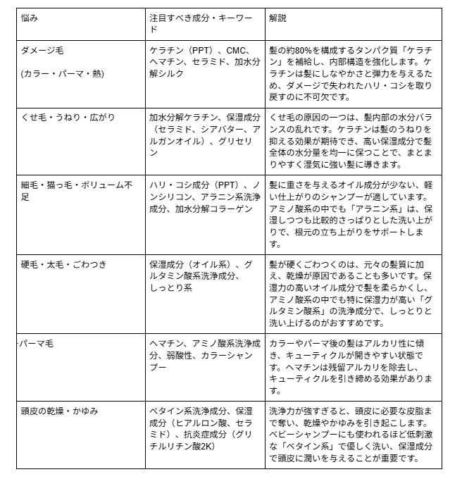 シャンプー選びの出発点は、自分自身の髪と頭皮を正しく理解することです。以下の表を参考に、ご自身の状態をチェックしましょう。