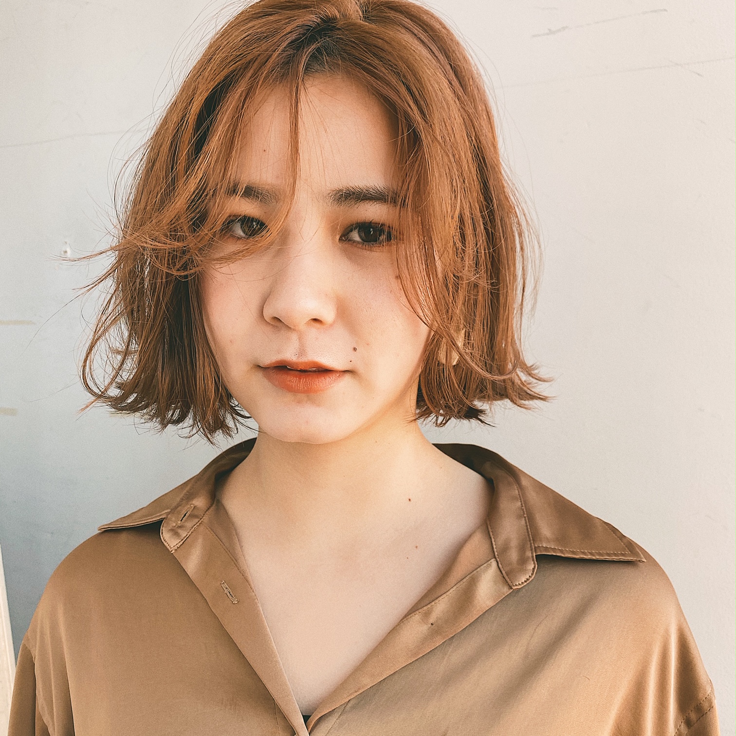 ヨーロッパの女の子のようなベイクドオレンジカラーがポイントのボブスタイル。伸ばしかけをカバーできる毛束をつくって周りの人と少し差をつけてみても。ヘアアレンジもしやすいレングスなので、幅広いスタイリングが楽しめるのも魅力です。スタイリングは、手ぐしでラフな雰囲気にオイルを全体的につけて、セミウェット感を出すのがコツ。