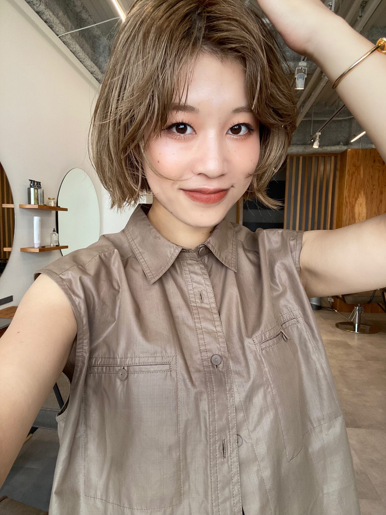 女性らしさのあるボブとミディアム、透け感たっぷりのベージュカラーが得意。頭の形にフィットするお洒落なミニボブや肩上の長さが得意。派手にならない上品なベージュカラーもお任せください。