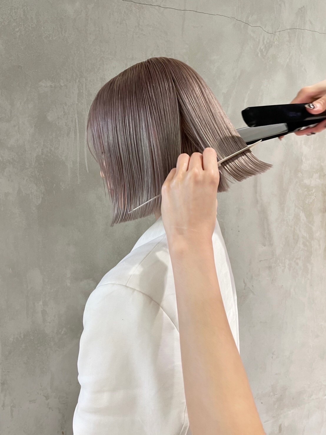 ミニボブから伸ばし始めるならカラーで変化をつけるのもおすすめ。思い切ってブリーチして入れるハニーベージュは、周りと差をつけてくれます。前髪は頬骨下でカットし、全体はあごよりも少し上で重めのラインを残してぷっつりと仕上げるのがコツ。スタイリングは、耳にかけるのでさらっとストレートアイロンを通すだけでOK。前髪は頬骨から後ろに向かって流れるように、アイロンを縦に通すのもポイント。