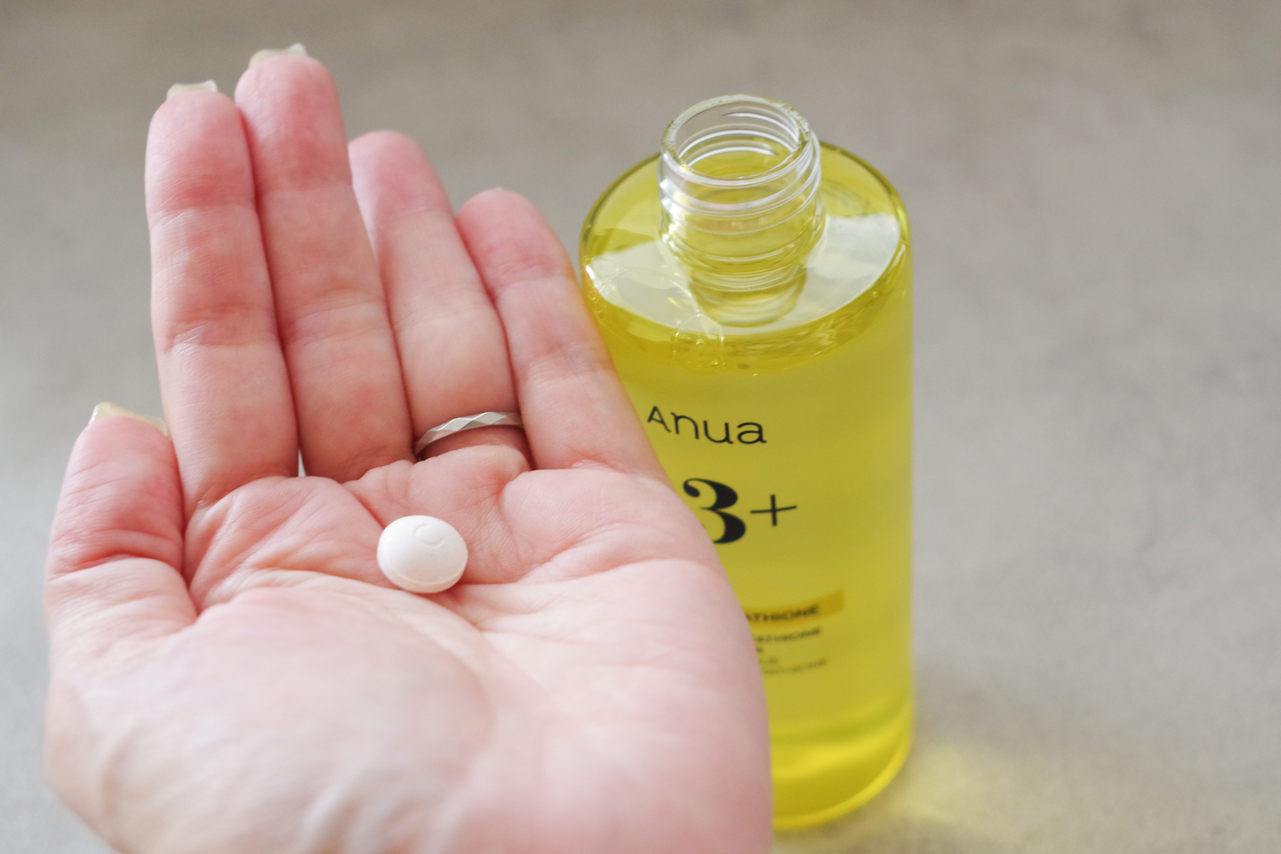 ビタミンCの特性に配慮し、新鮮な状態で使うために開発されたというのがユニークな点。炭酸*¹・ビタミンC・ビタミン誘導体*²・グルタチオン*³の成分をタブレット錠にした「ANUAバイタルスパークリングボール」をはじめに自分で「ビタミン3グルタチオンスパークリングトナー」に投入することで、フレッシュに使うことができます。