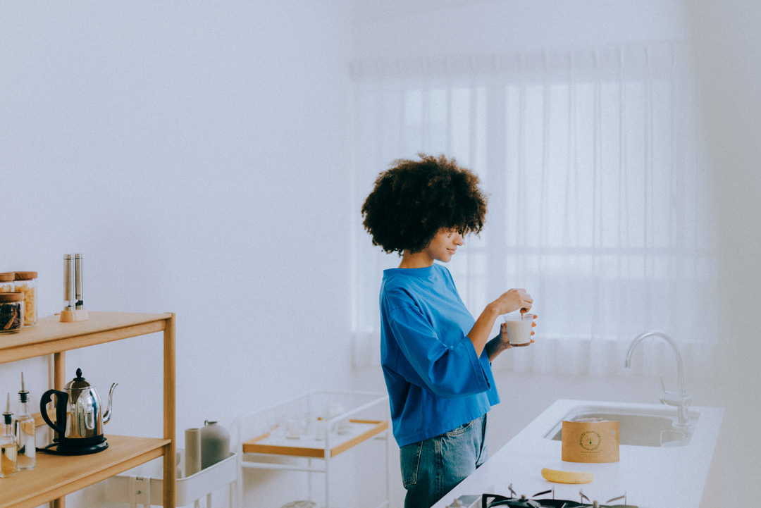 レピールまめ鉄(パウダー) 45g ¥8618 / LepeelOrganics(レピールオーガニックス)、Tシャツ¥8580 / MidiUmi(マザーズインダストリー)、デニムパンツ¥35200/ THE SHINZONE(シンゾーン ルミネ新宿店)