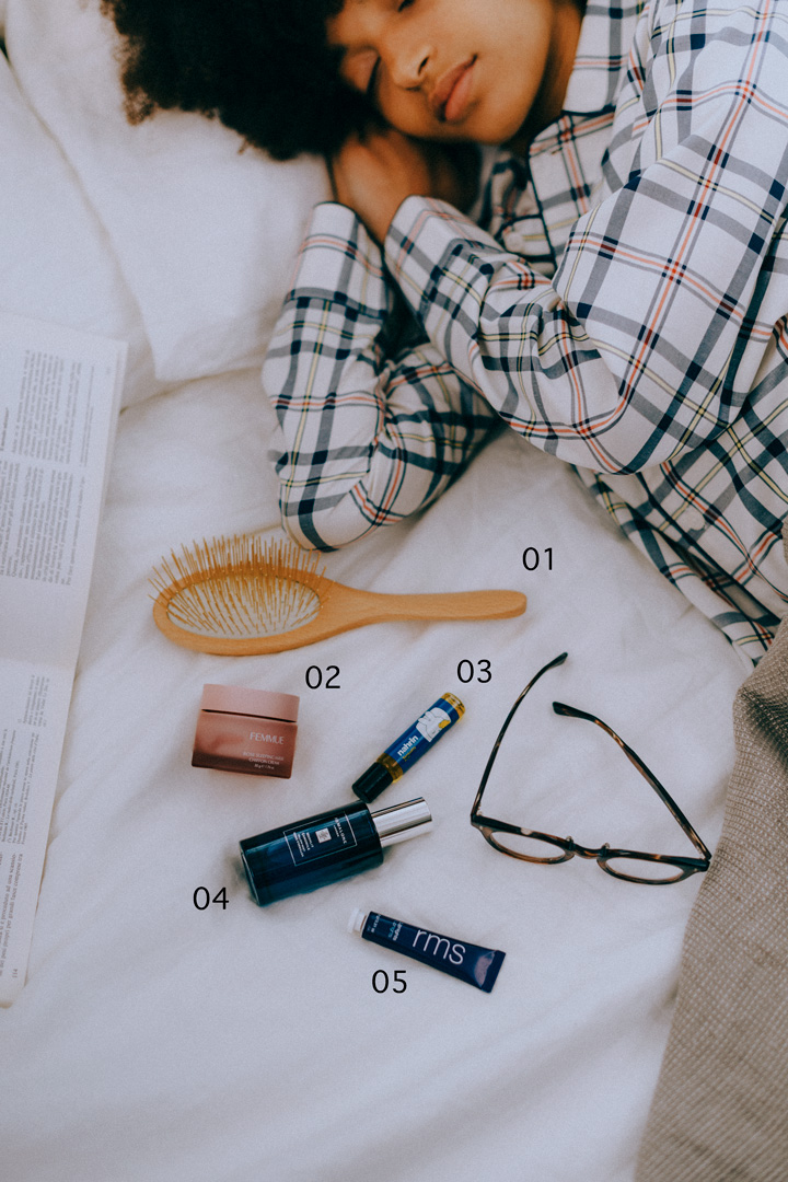 01_ 24 Kゴールドメッキのピンが頭皮と毛根を心地よく刺激。寝る前のブラッシングで、疲れを取り除いて。プレミアム FOX カッサ ウッド ヘアブラシ¥18480/SNOW FOX SKINCARE(スノーフォックススキンケア) 02 _ ダマスクローズを閉じ込めたジェルクリーム。夜のお手入れの最後に塗って一晩おけば、翌朝ぷるぷるの肌に。FEMMUE ローズウォーター スリーピングマスク 50g ¥4290 /FEMMUE( アリエルトレーディング) 03_ローズ、イランイラン、パチョリ、ラベンダー etc. リラックス効果抜群のハーブオイルが心地よい眠りをサポート。すやすやミッフィちゃんにもキュン。miffy センシュアル ロールオン 10mL ¥3080 / nahrin(コスメキッチン) 04_ カモミールとムーンフラワーの清く柔らかな香り。枕やシーツにシュッとひと吹きするのをお休み前のルーティンに。ナイト コレクション ムーンリット カモミール ピロー ミスト 50mL ¥7150 /JO MALONE LONDON(ジョー マローン ロンドンお客様相談室) 05_シアバターとカカドゥプラムオイルなどが寝ている間に潤いを閉じ込めて、朝イチからふっくら唇に仕立ててくれる。リップナイツオーバーナイト リップマスク スリープオーバー 9g¥4950/rms beauty(コスメキッチン)