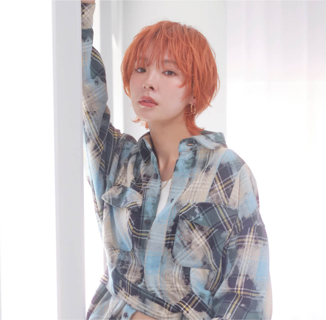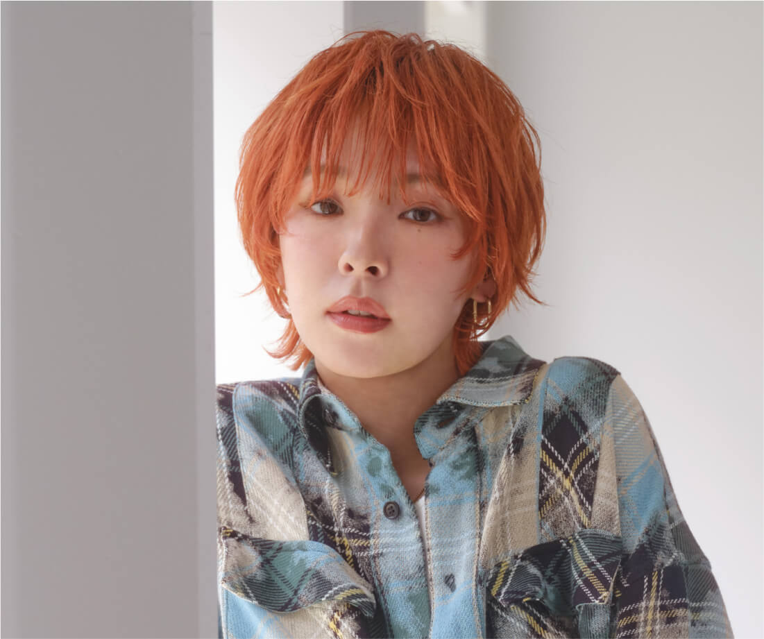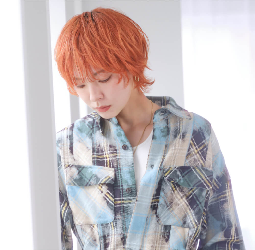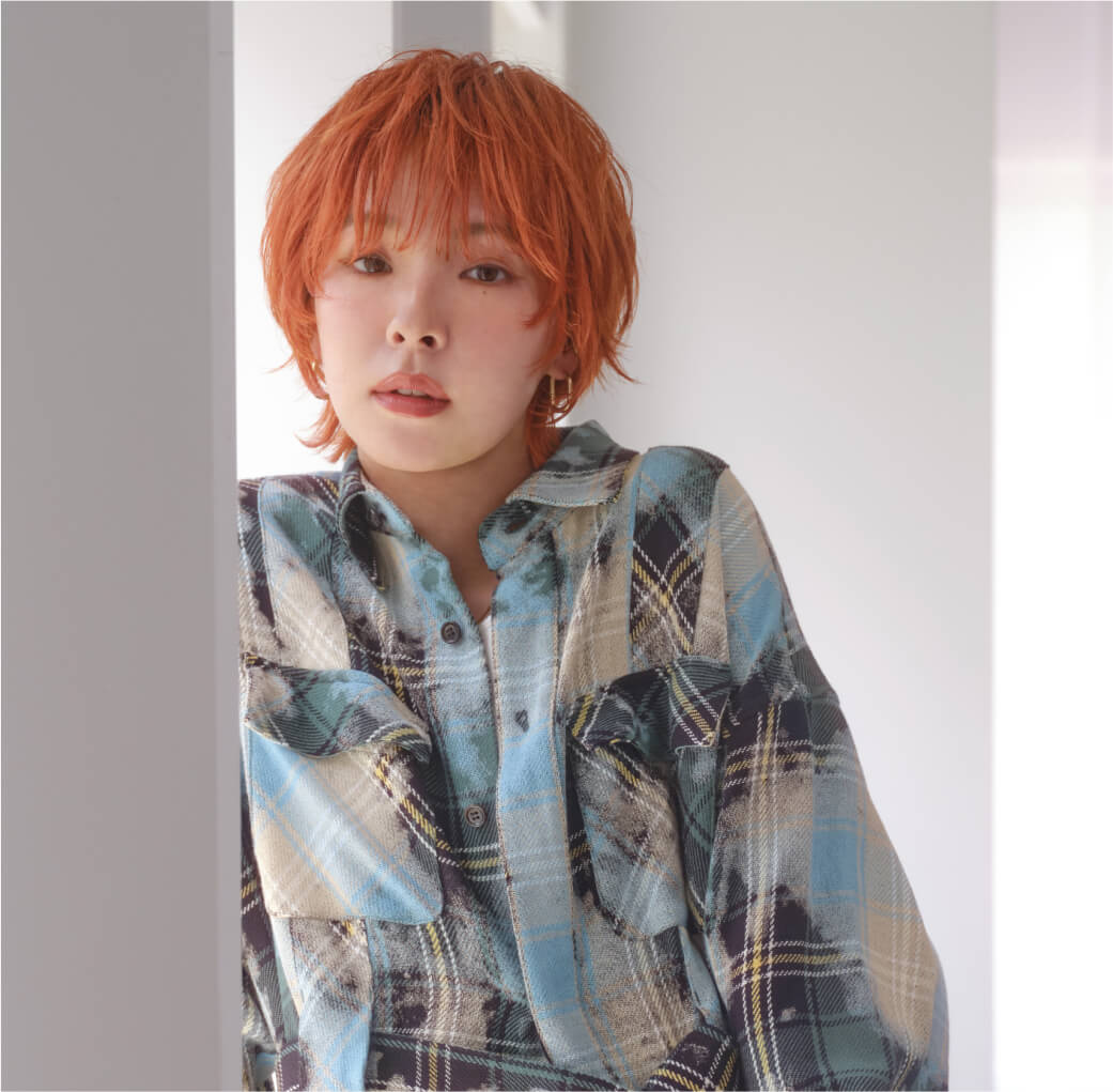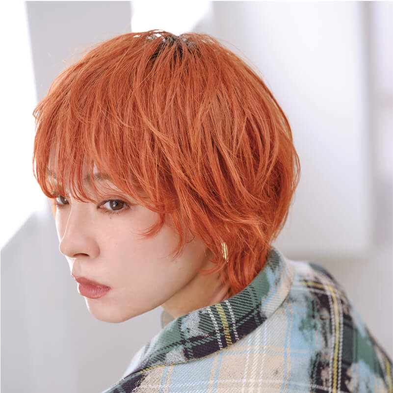 根元をはずして鮮やかなオレンジをオンカラー。色のコントラストで奥行きを出し、ショートをより軽快かつモードな印象にチェンジ。ビビッドながら服になじみやすく、毎日のスタイルに新鮮さを添えてくれる。