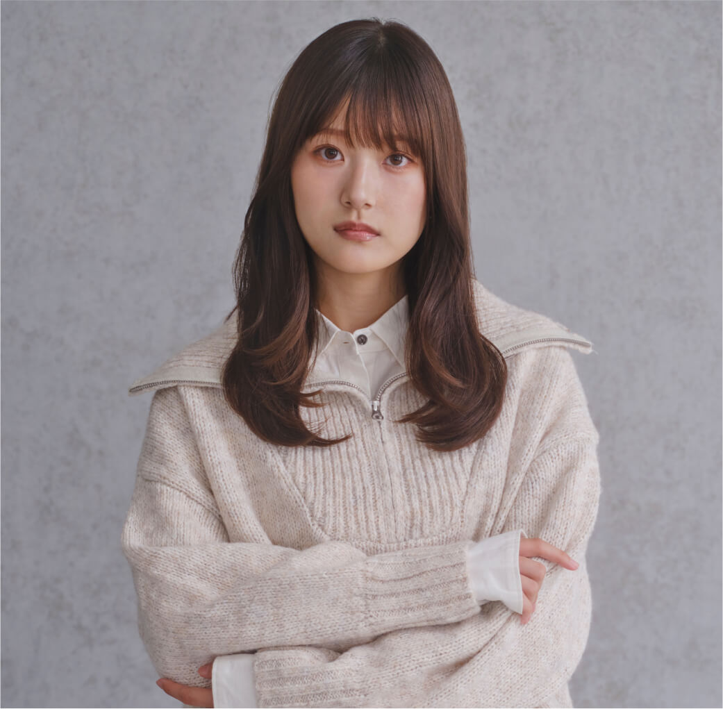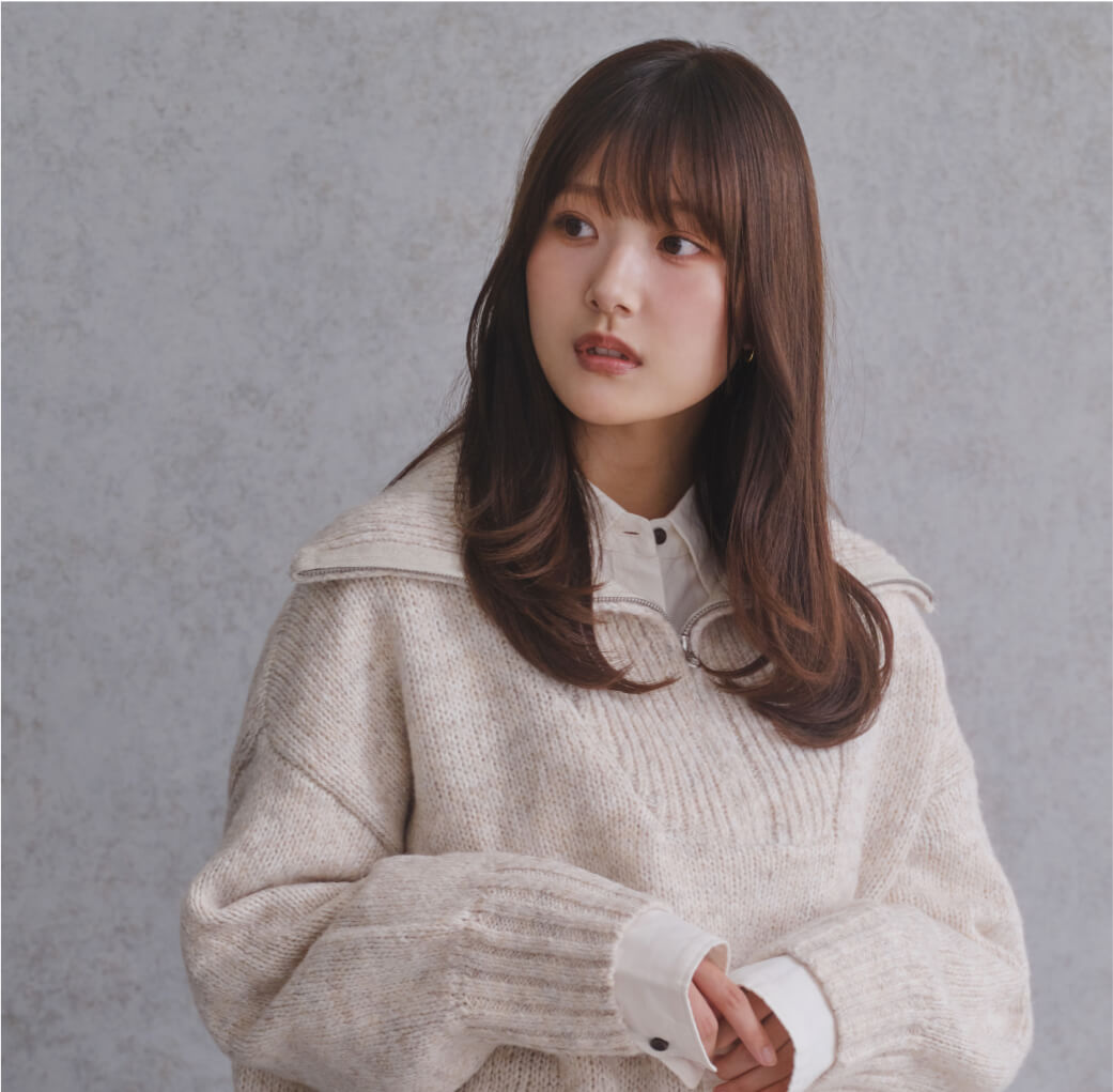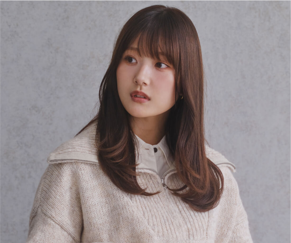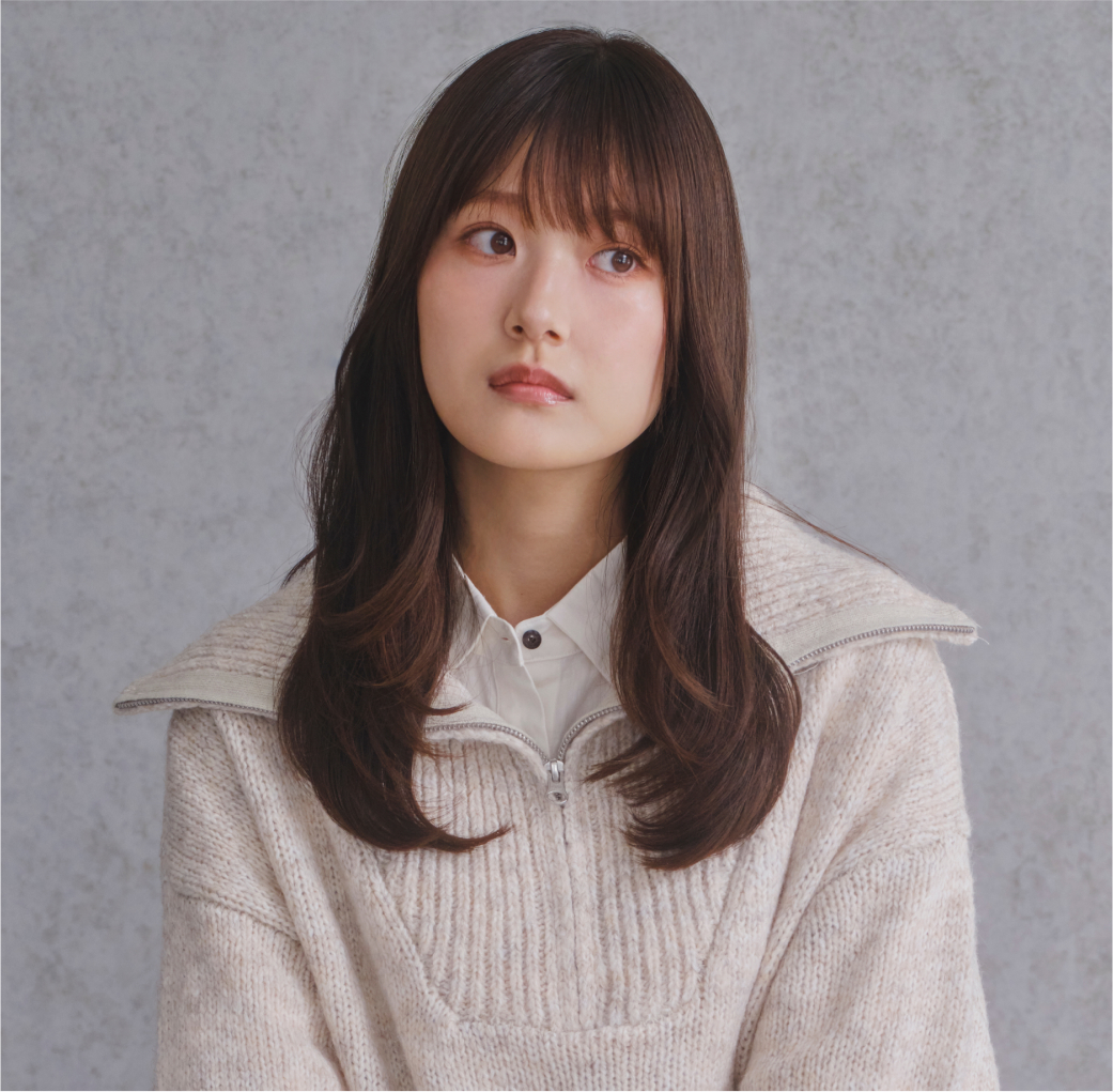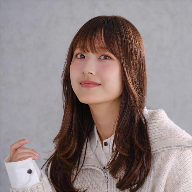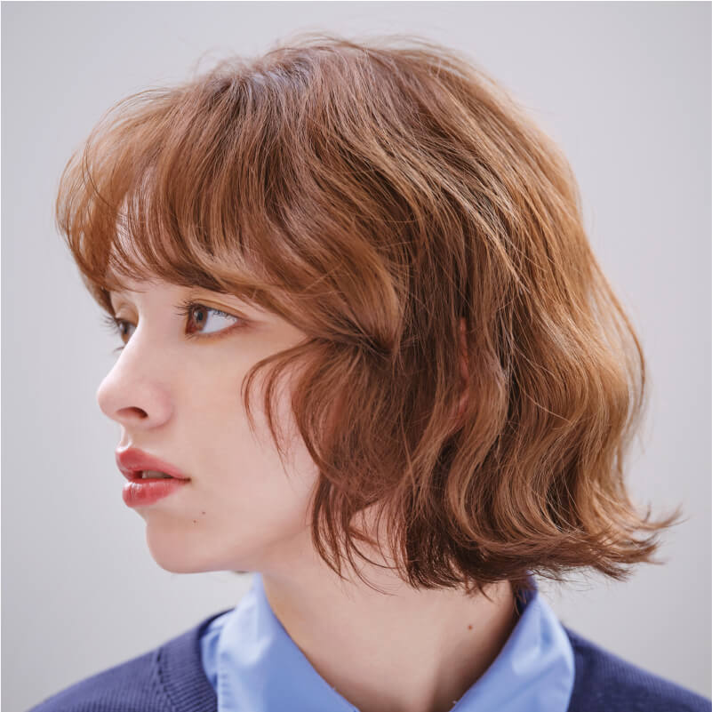 赤みブラウンとベージュが織りなすウォームブラウンは、秋冬のコーデに柔らかな輝きをプラス。クリアな発色とふわっと軽い質感が、ゆるやかなパーマボブにベストマッチ。レッド系カラーのトレンドをナチュラルに取り入れつつ、こなれたムードで毎日に彩りを。