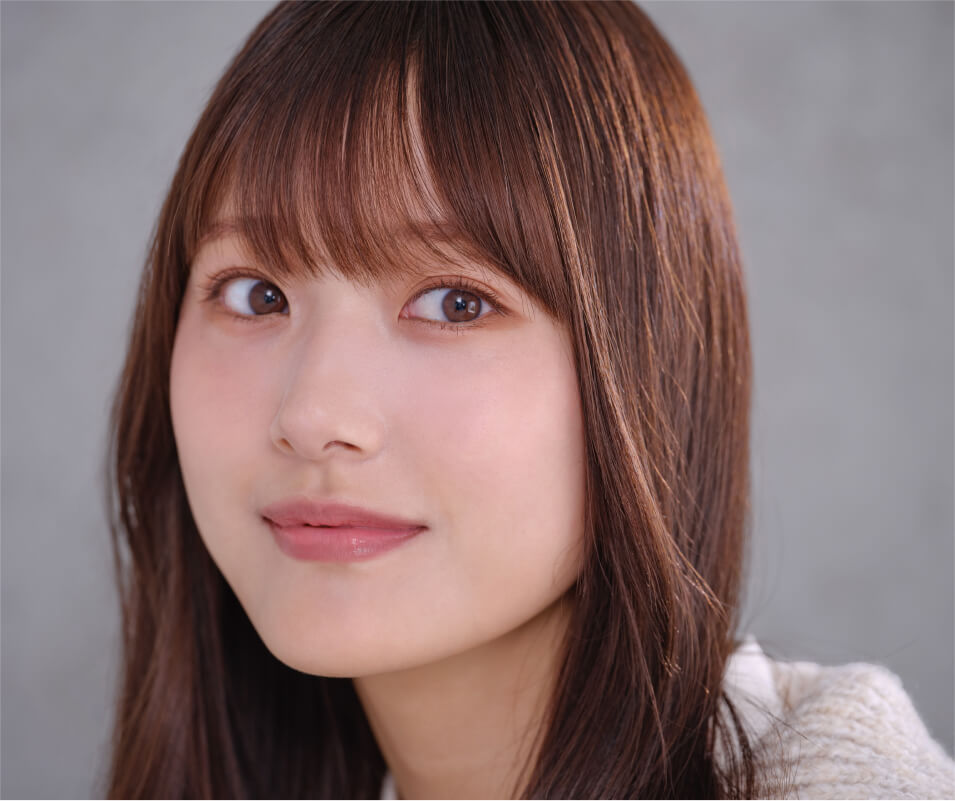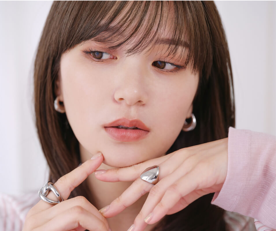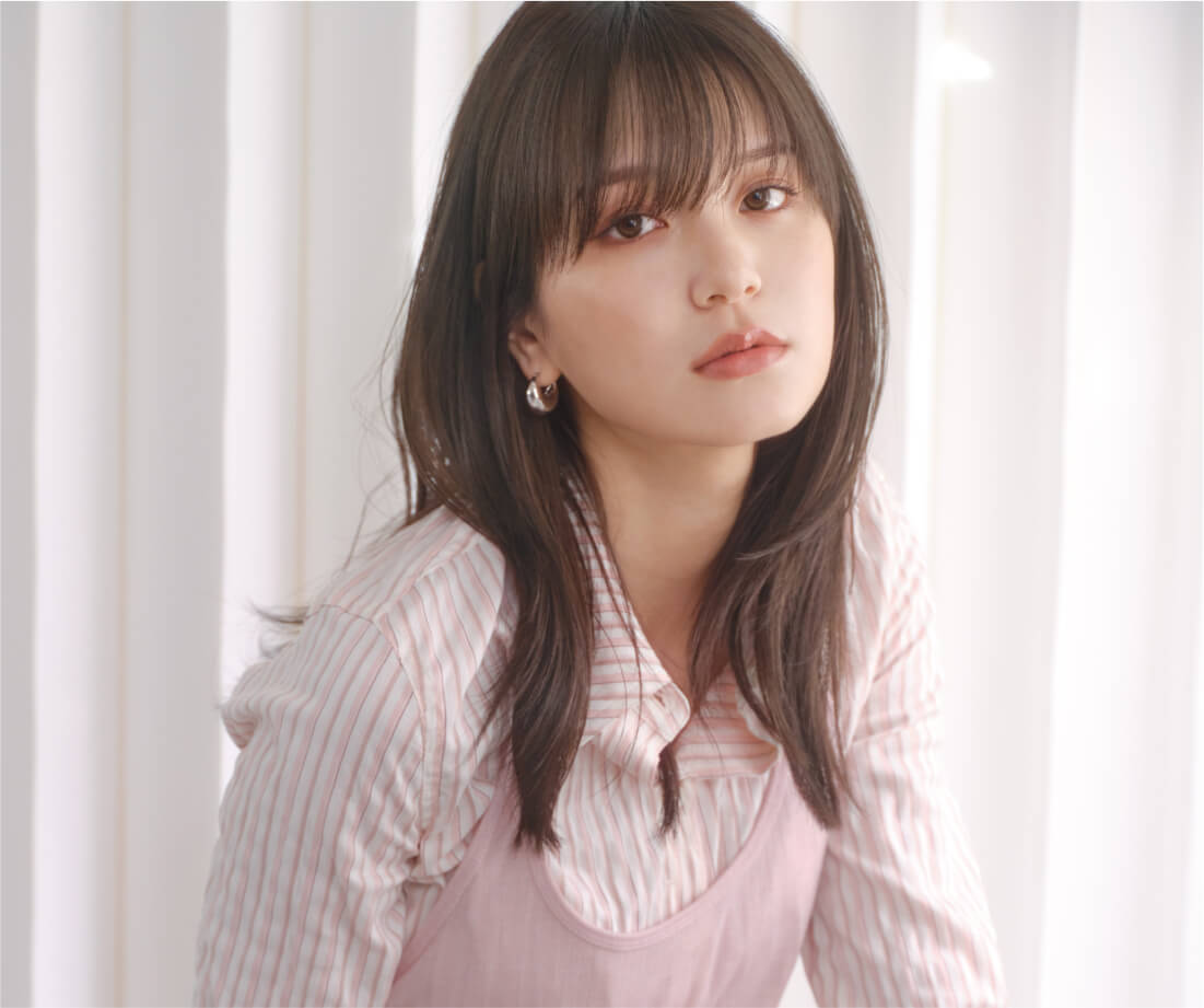 パール感のある淡いピンクのチークを頬の中央寄りに丸く広げ、ふわっとにじむような血色感を演出。肌はセミマットに仕上げつつ、ほんのりツヤをプラスすることでフェミニンな柔らかさを添えて。目元はブラウンブラックのアイラインとマスカラで引き締める。