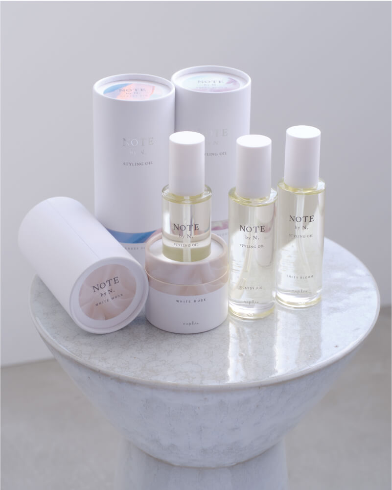 左から)潤いと香りが一日続く、マルチユースオイル NOTE by N. スタイリングオイル ホワイト ムスク 100ml ¥4400、狙った動きを自在にキープする軽やかなスプレー N. ホールドヘアスプレー 5 180g ¥1760(ともに美容室専売品)
