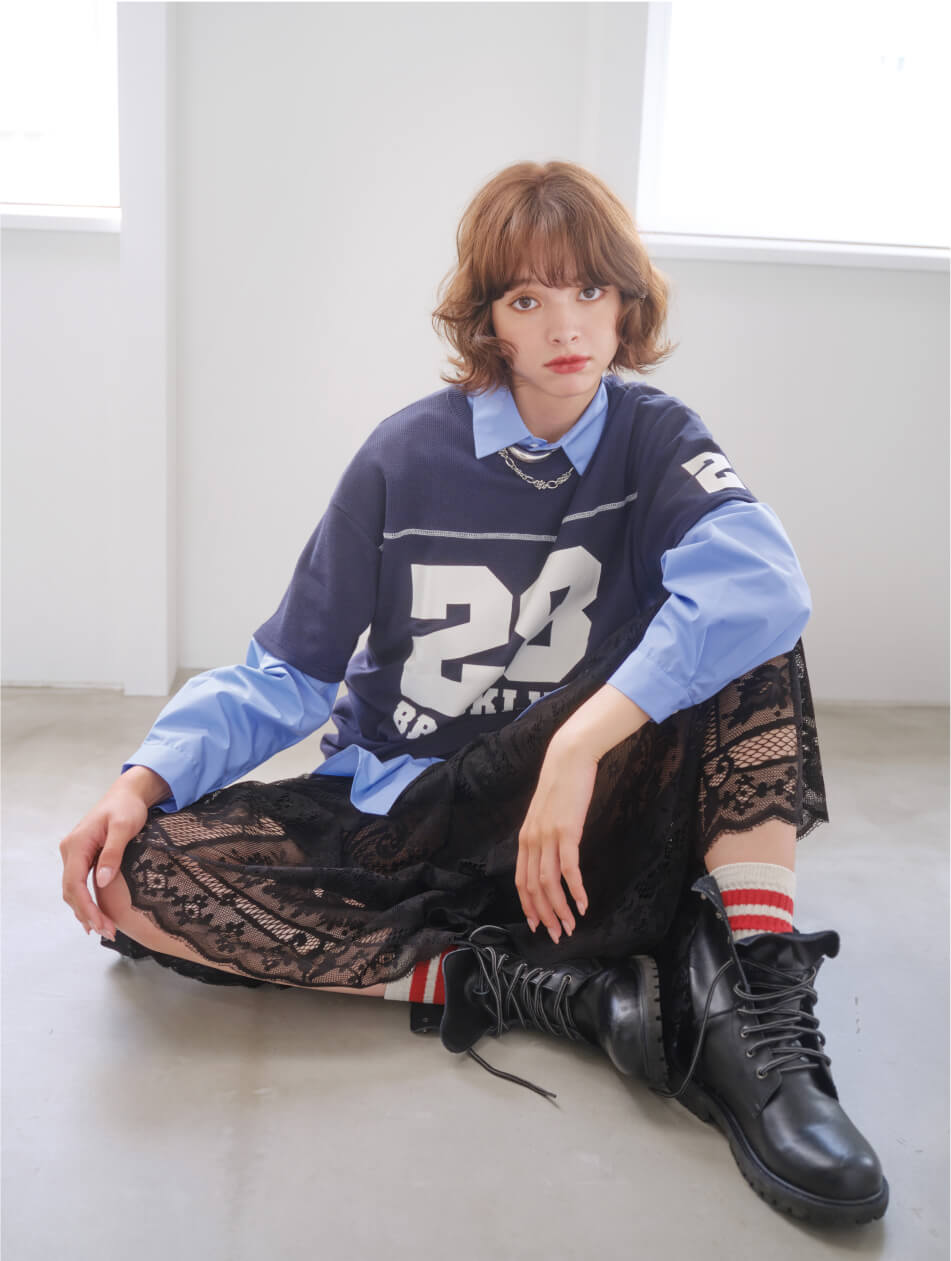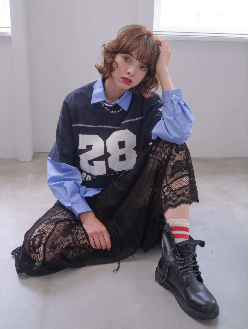 ガーリーなレーススカートを、カジュアルなナンバリングTシャツで外したコーディネート。襟や袖、裾からシャツをのぞかせれば、おしゃれ度がぐっとUP。ブーツに合わせた赤のラインソックスで、色を効かせながらスポーティなアクセントを。