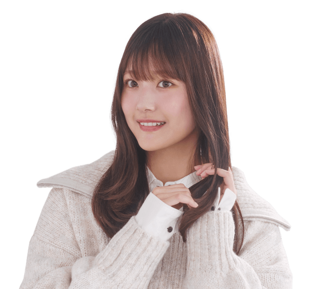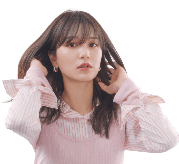 つむじまわりの表面はストレートアイロンで軽く丸みをつけ、毛先は外ハネに仕上げることで軽やかな雰囲気に。仕上げは2プッシュのオイルを中間から毛先に馴染ませ、サラッと光沢感のある質感に整える。