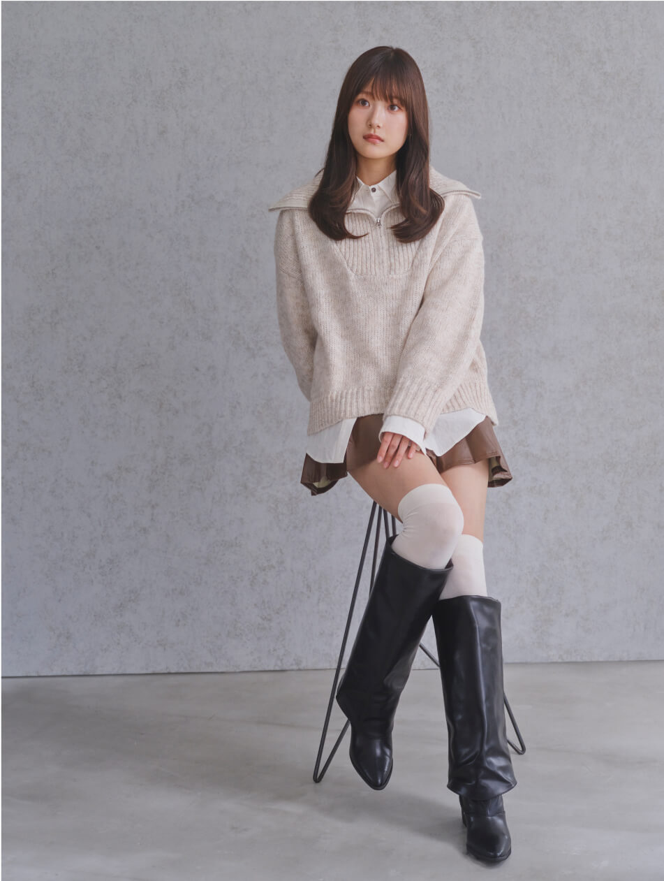 甘くなりがちな白のニットは、シャツを重ねてほどよくカチッと。今季トレンドのレザーをブーツとミニスカートで取り入れ、エレガントなムードに。髪色とリンクしたブラウンのスカートで統一感を出し、サイハイブーツで今っぽいバランスを完成させて。
