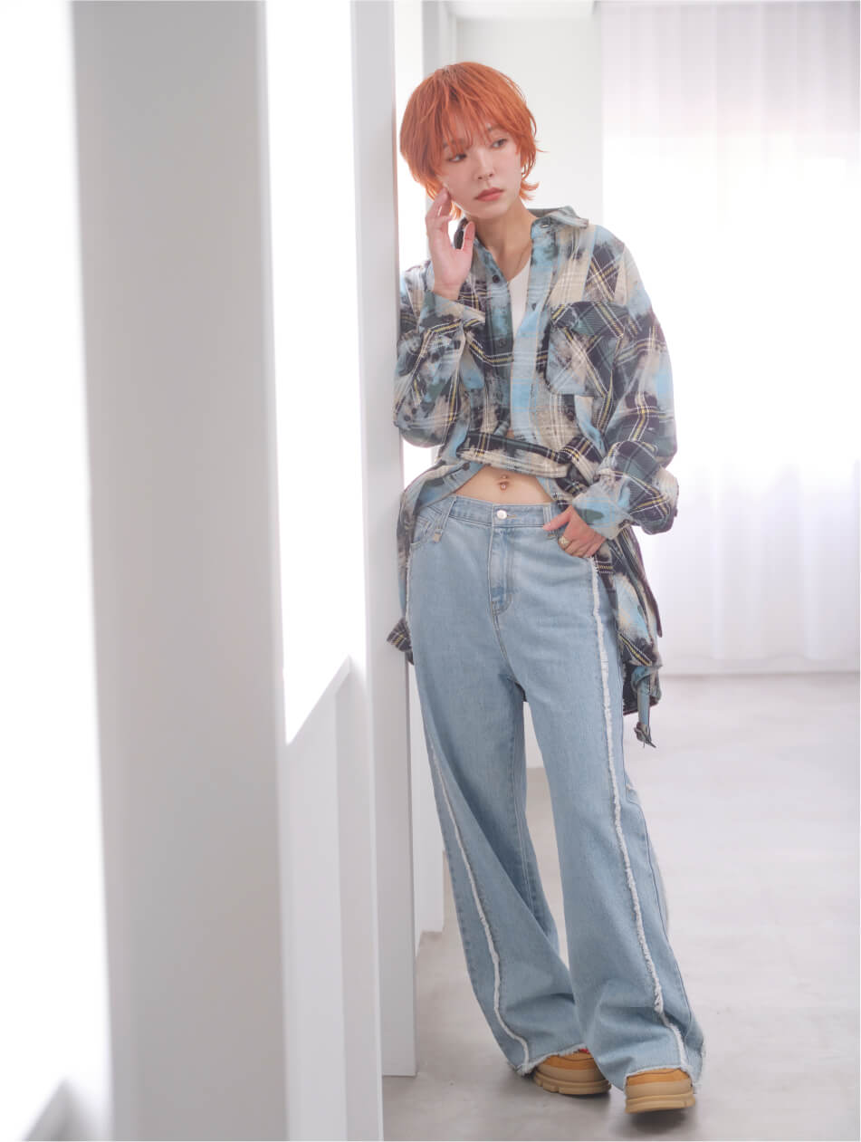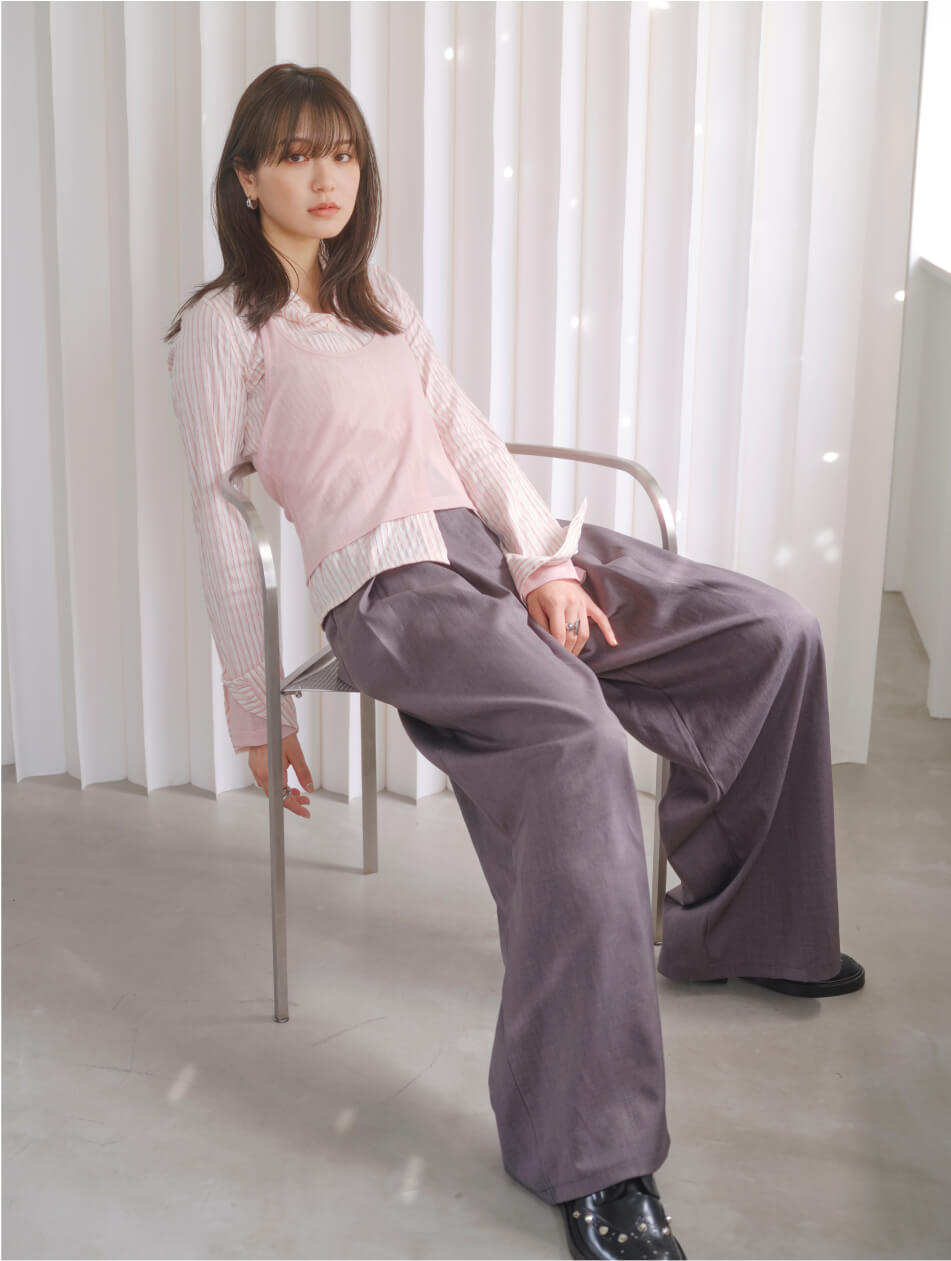 柔らかなオリーブカラーの髪に合わせ、全体を淡いトーンで統一。ベビーピンクは細身ビスチェやシャツで取り入れ、グレーのワイドパンツで韓国らしいスタイリングに。足元はスタッズ付きシューズで辛口なアクセントを効かせて大人っぽさを取り入れるのがカギ。