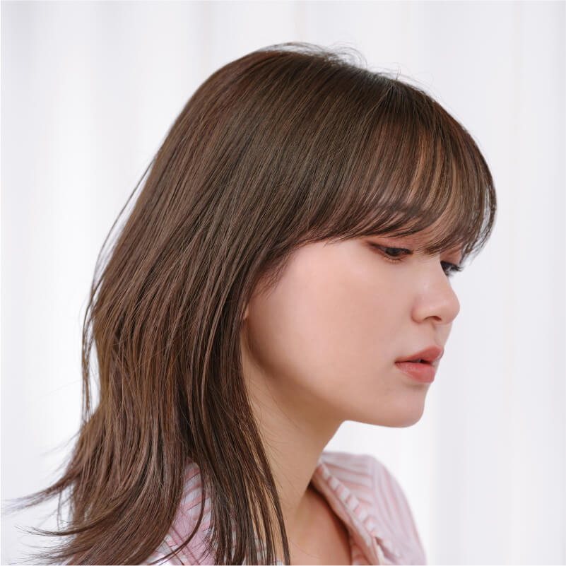 人気のチェスナットに、オリーブのニュアンスを添えるペリドットとグリーンをブレンド。さらにモーヴをひとさじ加えることで、褪色による黄みを抑え、澄んだ色みをキープ。赤みを感じさせないニュートラルなベージュが、髪全体を柔らかく、透明感のあるムードへと導く。