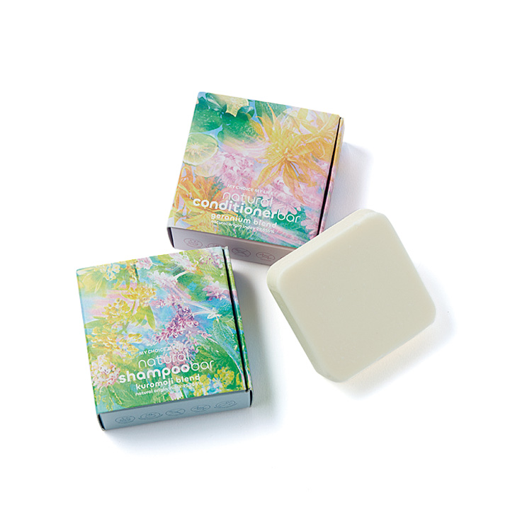 手前からナチュラル シャンプー バー クロモジブレンド、ナチュラル コンディショナーバー ゼラニウムブレンド 各¥3000/ともにMCML(MY CHOICE MY LIFE)