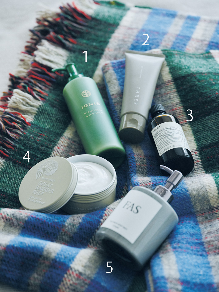 1.お休み前のひと時をリラックスタイムに変えるナイトウェルシリーズに、ボディミルクが仲間入り。乾燥によるダメージからごわついた肌をやわらげ、うるおいを与えてしっとりなめらかな肌へ。ナイトウェル ボディミルク 240㎖ ¥4400[11月18日発売]/IGNIS(イグニス) 2.もっちりとしたハリを与える5つの植物種子由来成分を配合。乳液のようにスルスルと伸びて、すぐになじむ使いやすさ。ローズマリーやコモンタイムをメインとする精油100%の香り。THREE エッセンシャルセンツ トリートメント フルボディ エマルジョン 01 100㎖ ¥5500[10月15日発売]/THREE(スリー) 3.肌にスッとなじんでやわらげる集中保湿オイル。ほのかに甘いゼラニウムの香りにもうっとり。ゼラニウム ボディトリートメント 100㎖ ¥4950/Aesop(イソップ) 4.レモンピールやスペアミントの生き生きとした香りが心地よい濃密ムース。ホイップクリームのような軽いテクスチャーながらシアバターやカカオバターなど植物オイルの力で、しっかりうるおう。ボディムース グレートバリアリーフ 150㎖ ¥4840/MAINE BEACH(三和トレーディング) 5.大人の肌悩みに1ステップで働きかけるボディミルク。京都産発酵はちみつエキスに含まれるPHAが古い角質をやわらげて、独自開発成分の国産繭シルクエキスがうるおいを与えながら紫外線ダメージもケア。ザ ドレープ ボディミルク Y GIRI 250㎖ ¥6930[10月22日発売]/FAS(シロク)