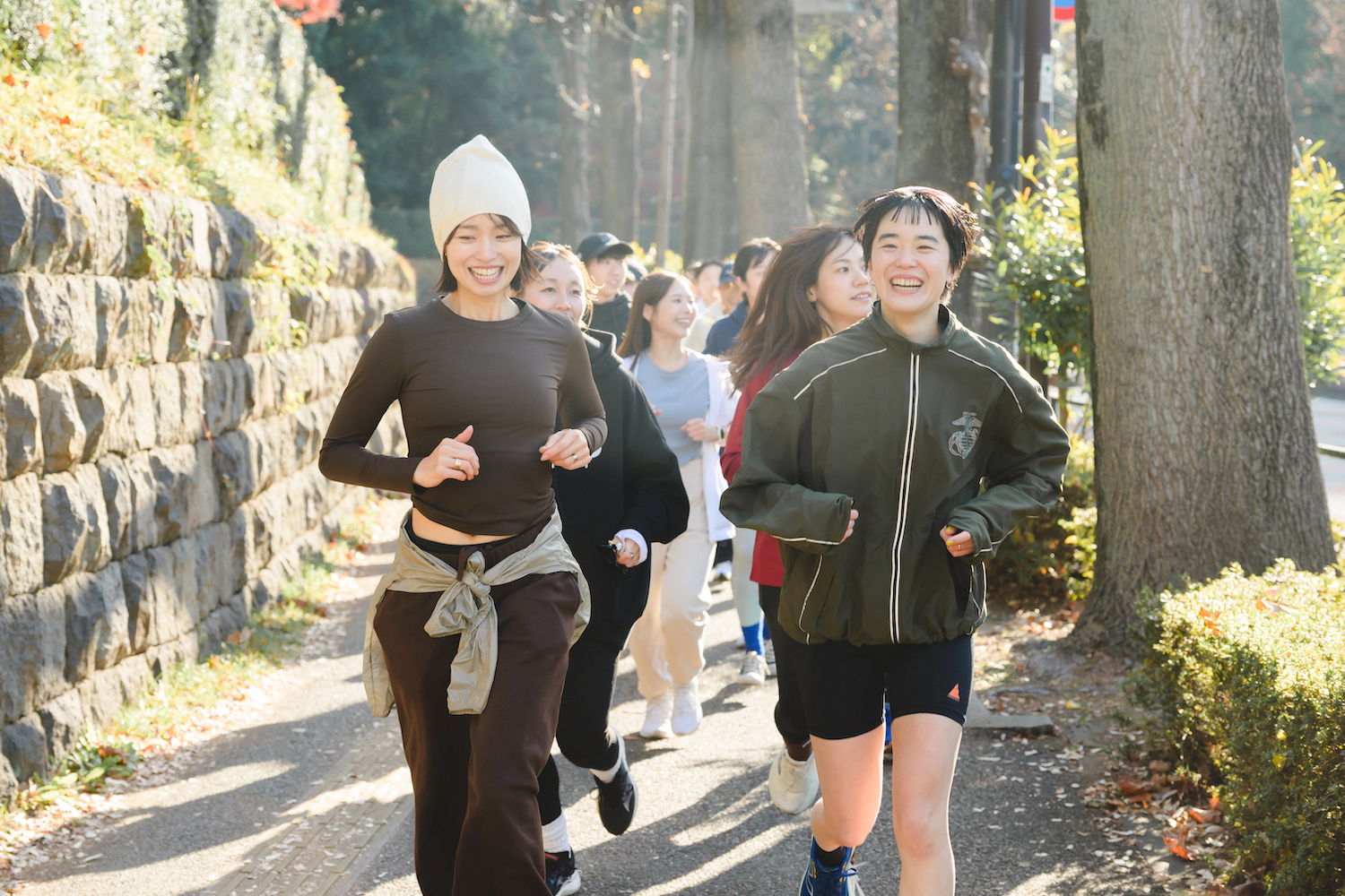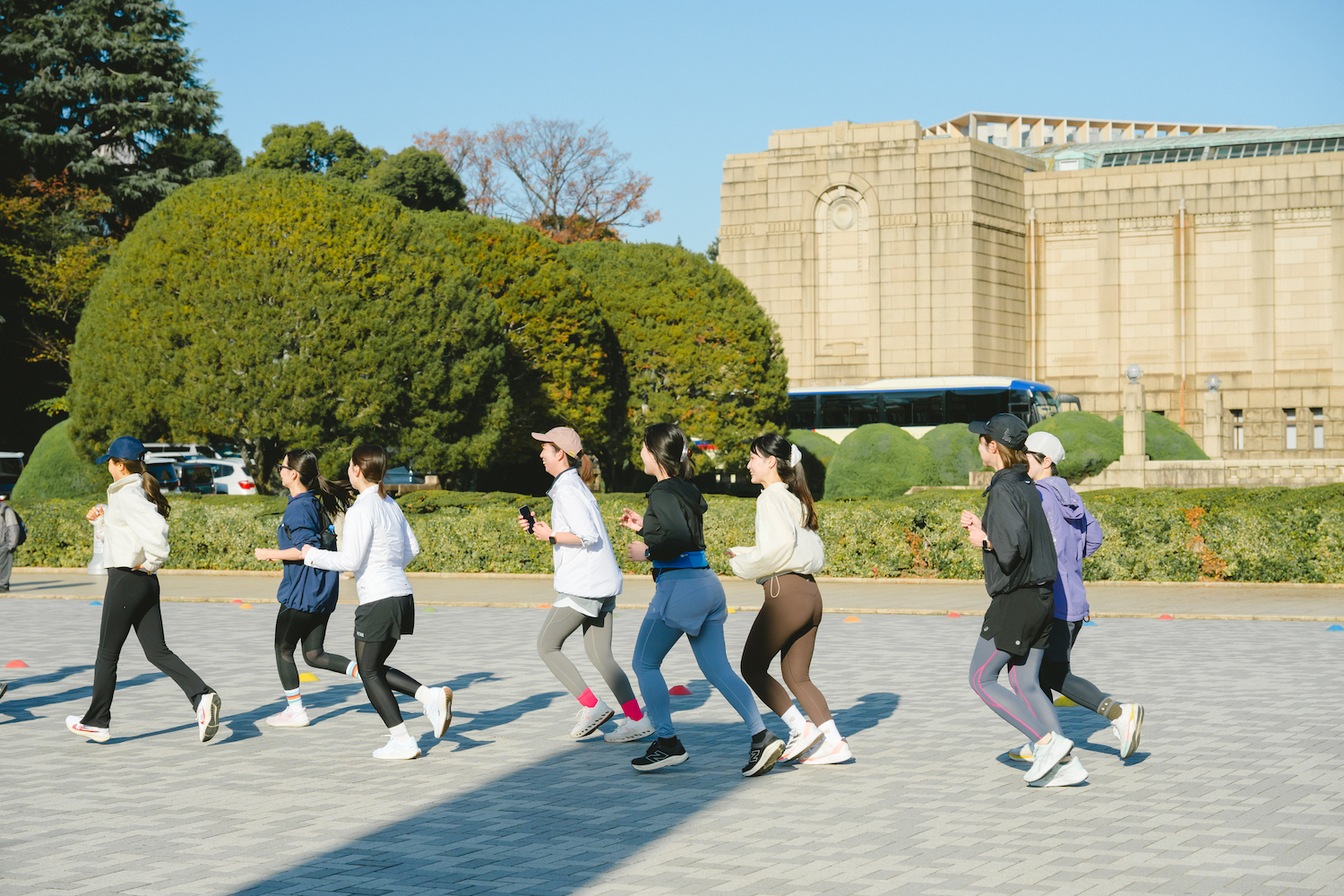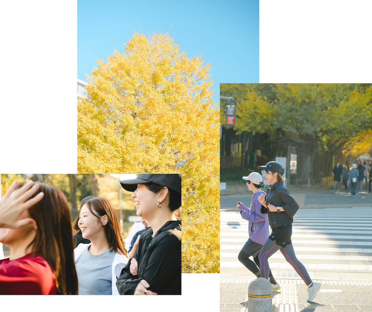 準備が整ったところで、桜子ちゃんと麻衣子さんを先頭に、外苑前方面へジョグスタート!今回は聖徳記念絵画館まで向かい、明治神宮野球場や満開のイチョウを眺めながら戻る約3kmのコース。名所も多く、走りながら景色を楽しめます。