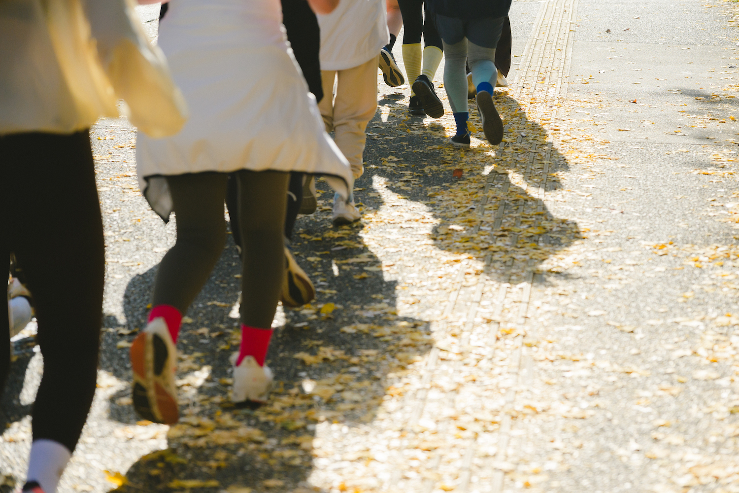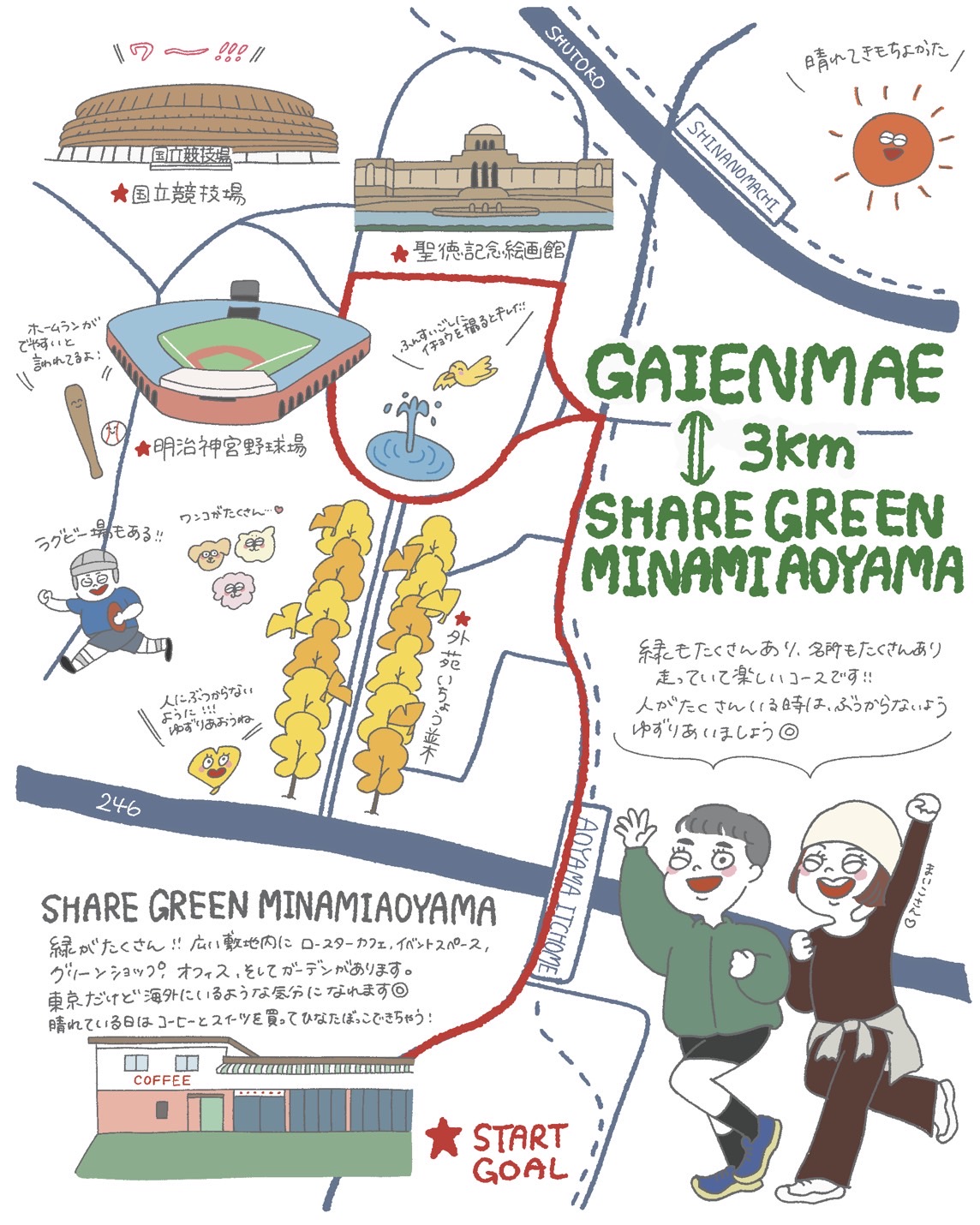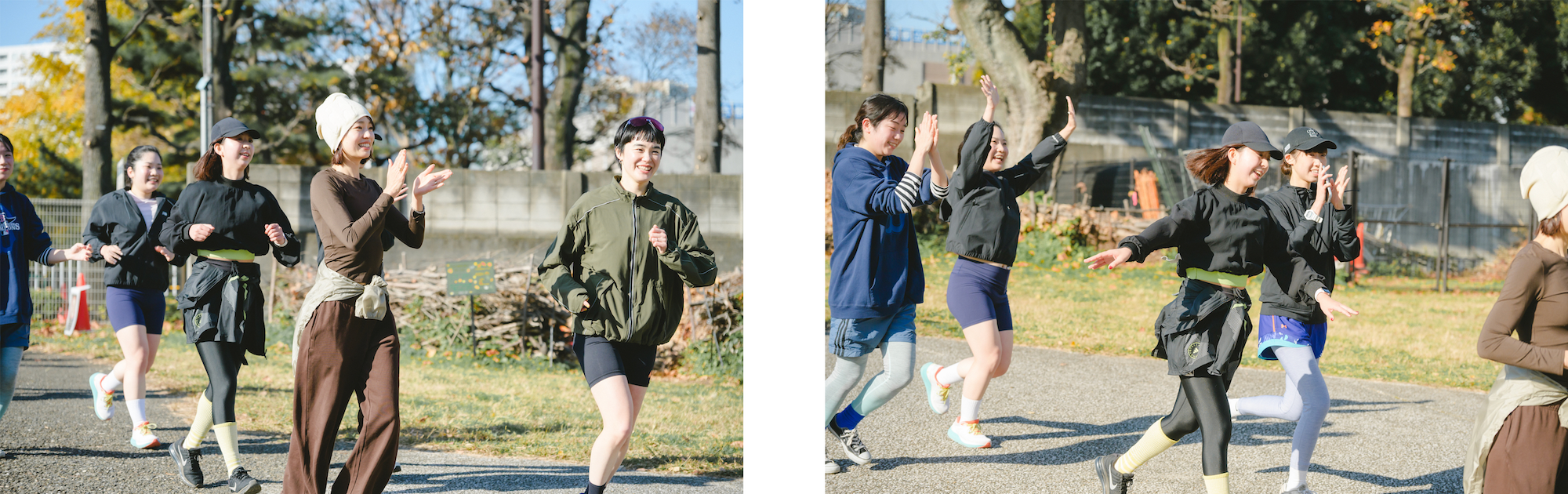 準備が整ったところで、桜子ちゃんと麻衣子さんを先頭に、外苑前方面へジョグスタート!今回は聖徳記念絵画館まで向かい、明治神宮野球場や満開のイチョウを眺めながら戻る約3kmのコース。名所も多く、走りながら景色を楽しめます。
