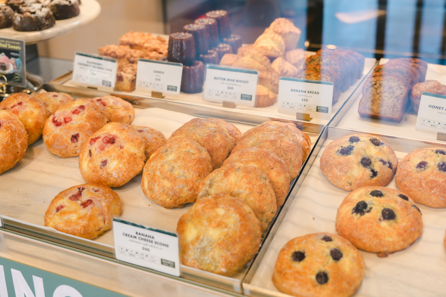 〈シェアグリーン南青山〉内の、開放感あふれるコーヒーロースターカフェ。セレクトから焙煎、抽出までこだわったスペシャルティコーヒを楽しめます。さらにベイクコーナーには、ペイストリーがずらり。中でもフルーツとクリームチーズを混ぜ込んだ、ハワイアンスコーンのように平らで大きなスコーンが人気でした。売り切れ次第終了なので、気になる方はお早めに!