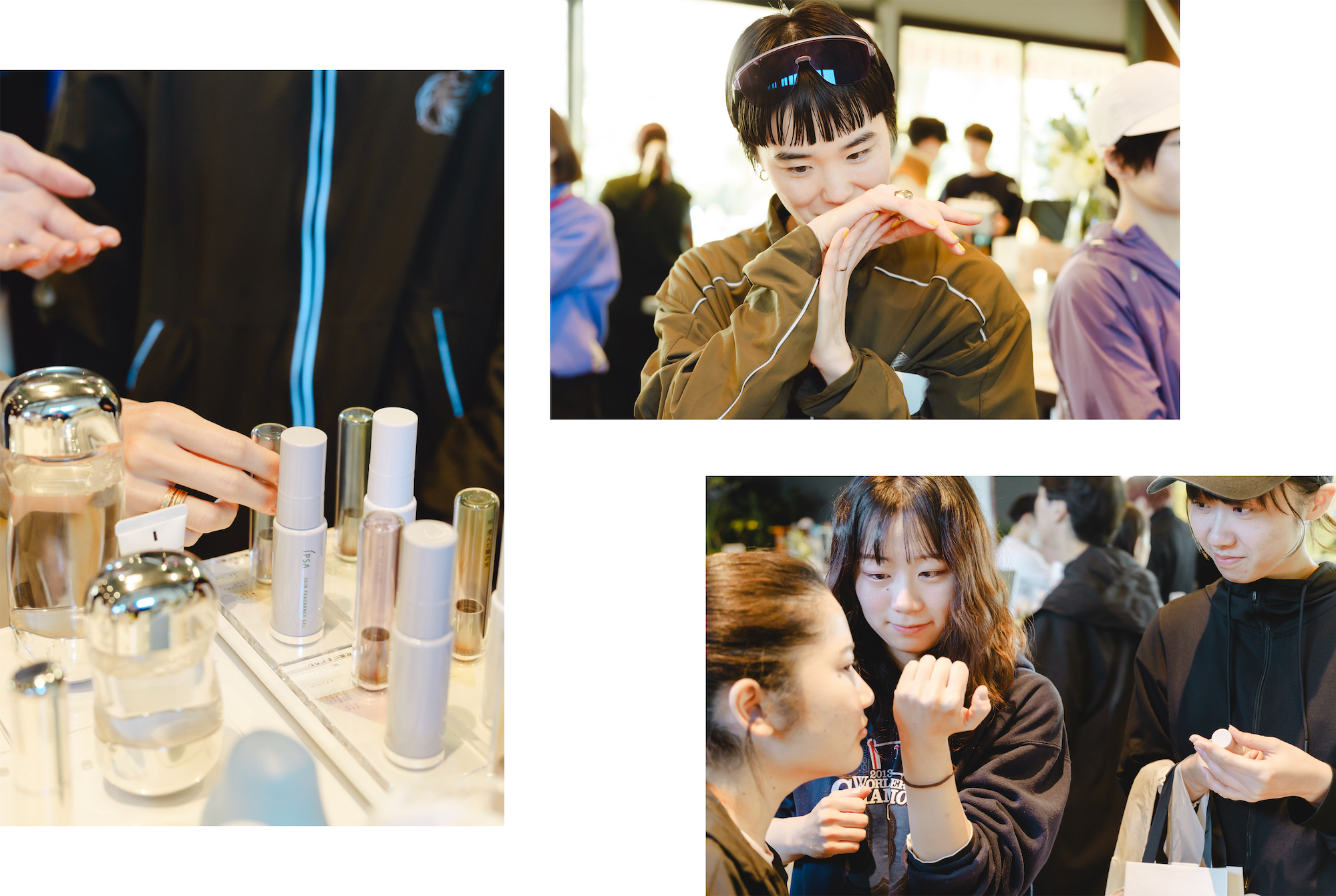 さらに注目を集めていたのが、今年デビューした「スキンフレグランスジェル」。ジェルタイプで、つけたいところにポイント使いできるのが嬉しいポイント。6種類の香りから、桜子ちゃんのお好みは朝露の庭をイメージした01。麻衣子さんは、穏やかな甘さの05が気に入ったよう。1日の始まりや仕事前、リラックスしたい夜など、シーンに合わせて使いたい!とみんな香りを楽しんでいました。