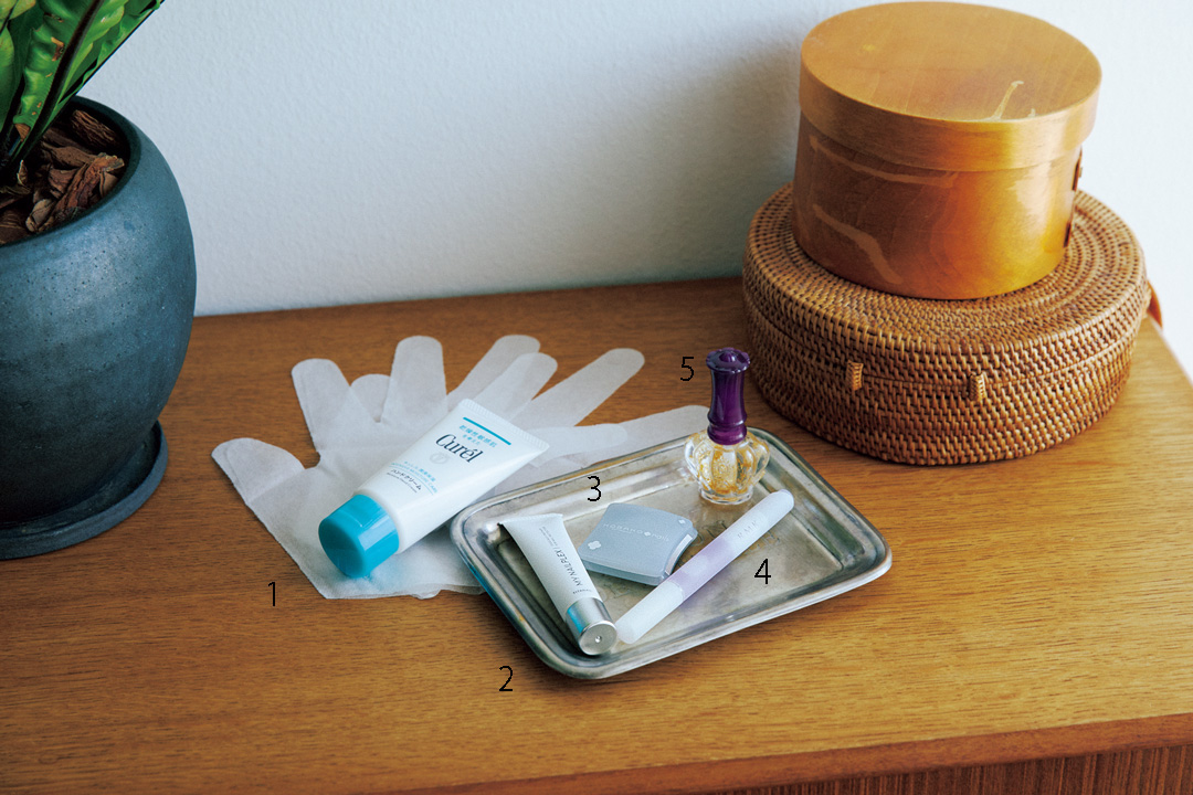 1.気づくと荒れてしまう乾燥性敏感肌の手指を、寝ている間にやわらかく整える手袋型シートマスク。ハンドクリームを塗ってはめれば独自開発の特殊なシートが湿潤環境を保って、翌朝はスベスベに。一晩中指先までまるごと守る お手入れ底上げ ハンドケアマスク[4枚入り]¥660、ハンドクリーム ¥1100[医薬部外品] ※ともに価格は編集部調べ/Curél( 花王) 2.割れやすかったり薄くなりがちな爪を補修・補強して、潤いのある艶やかな状態に導く美容液。8つのボタニカル成分とヒト幹細胞培養液を配合し、ささくれ防止にも効果を発揮。マイネイルプレックス ネイルトリートメントセラム 10㎖ ¥2475/MY NAILPLEX(チタニストラボラトリーズ) 3.小さなポーチにも収納しやすい正方形のネイルファイルは持ち歩きに最適! 不意に気になる爪先をどこででもケアできる。粗目・細目の2面の金属ヤスリを搭載し、爪の厚さや状態によって使い分けが可能。コンパクトネイルファイル ¥2420/KOBAKO(貝印 お客様相談室) 4.隠れた人気商品、指先用ジェルオイル。ホホバオイルやスクワランなど3種のオイルがすぐになじんでベタつかずしっとり。筆ペンタイプで細かい部分まで塗りやすく、かさばらないのも助かる。RMK ネイルケア ジェルオイル N 2.2㎖ ¥1650/RMK(RMK Division) 5.さらりとした質感で使いやすく、ティーローズの香りも心地いいネイルオイル。ローズヒップオイルなどの美容成分を配合し、指先をトラブルからガード。まるでスノードームのようにキラキラ光るゴールドも、使う前から気分を上げてくれる。ネイル ケア オイル N ¥1650/ANNA SUI(アナ スイ コスメティックス)