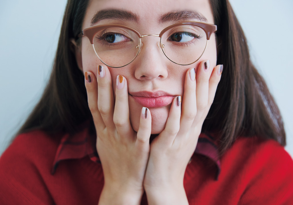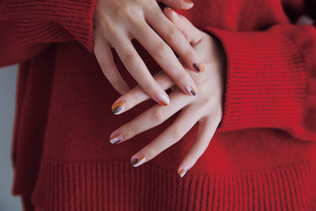 冬のニットにも多いカラー3色を組み合わせた三毛猫ネイル。特にルールはないけれど、1色ずつきちんと乾いてから塗ること、たっぷり目にトップコートを塗ることが成功のコツ。色のバランスを考えながら、少しずつ。