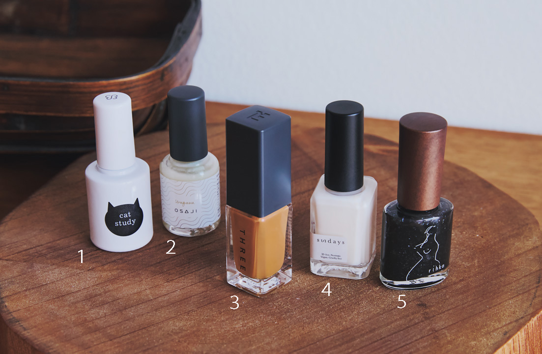 1.人気の猫モチーフコレクションから、黒猫の毛並みをイメージしたブラックシルバー。マグネットネイルなので(スティック別売り)、デザイン次第で自在な表情に。uka catstudy Kuroneko black 10㎖ ¥2750[限定発売中]/uka(ウカトーキョーヘッドオフィス) 2.水の中でチラチラと煌めく光のように、多彩な輝きを放つシェルホワイトでよりエレガントに。爪表面のバリア機能をサポートする、ディルシード由来の保湿成分・ケラチノモイストを配合。アップリフトネイルカラー 03 URAGAWA 10㎖ ¥2090/OSAJI(オサジ)3.モデルが「茶色」で使用したミルキーキャラメル。さりげなく散りばめられたレッドパールで、明るさを感じる指先に。傷やひび割れがしにくいクラックプロテクト処方を採用。THREE ネイルラッカー 08 UNIVERSAL RHYTHM ¥2420/THREE(スリー) 4.「白」で使用したやわらかなオフホワイトは、NY生まれのヴィーガンネイル。10種類の化学物質をカットし、スプルースや白樺などの天然由来成分でできている。ネイルポリッシュカラー ソフトホワイト No.43 10㎖¥2970/sundays(サハラ・インターナショナルグループ)5.モデル使用色。まろやかな黒に散りばめられたのは、フラッシュを焚いた時の光をイメージした大粒のシルバーグリッター。シンプルな中のちょっとした遊び心が、オシャレ三毛猫たる所以。リーカ ネイルポリッシュ lens 10㎖ ¥2970[限定発売中]/rihka(リーカ)