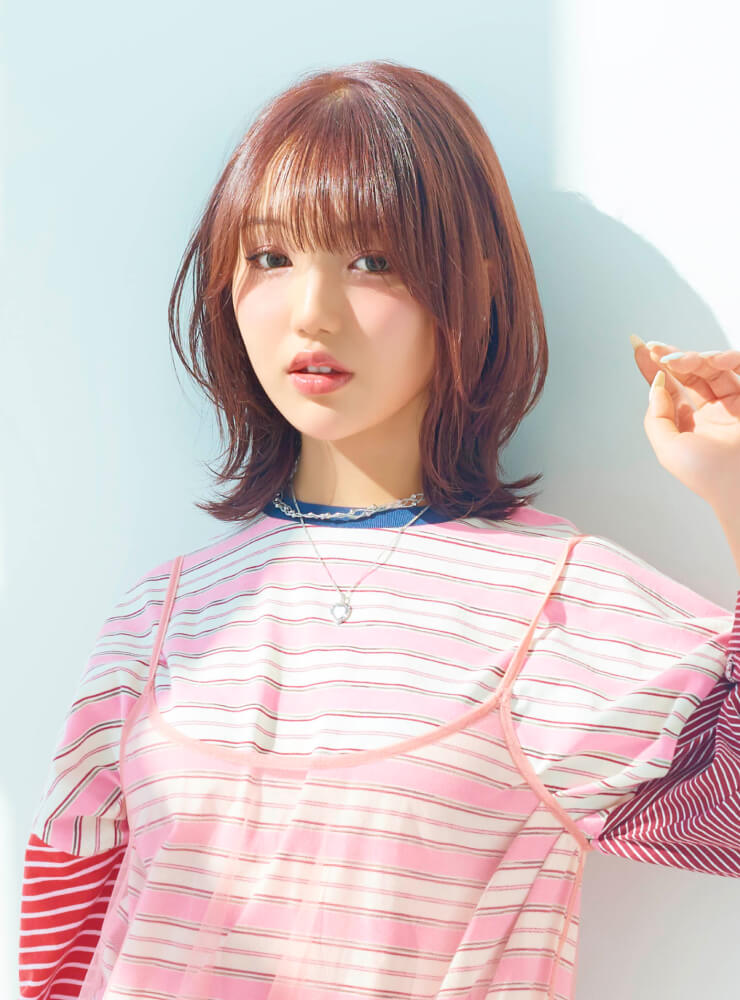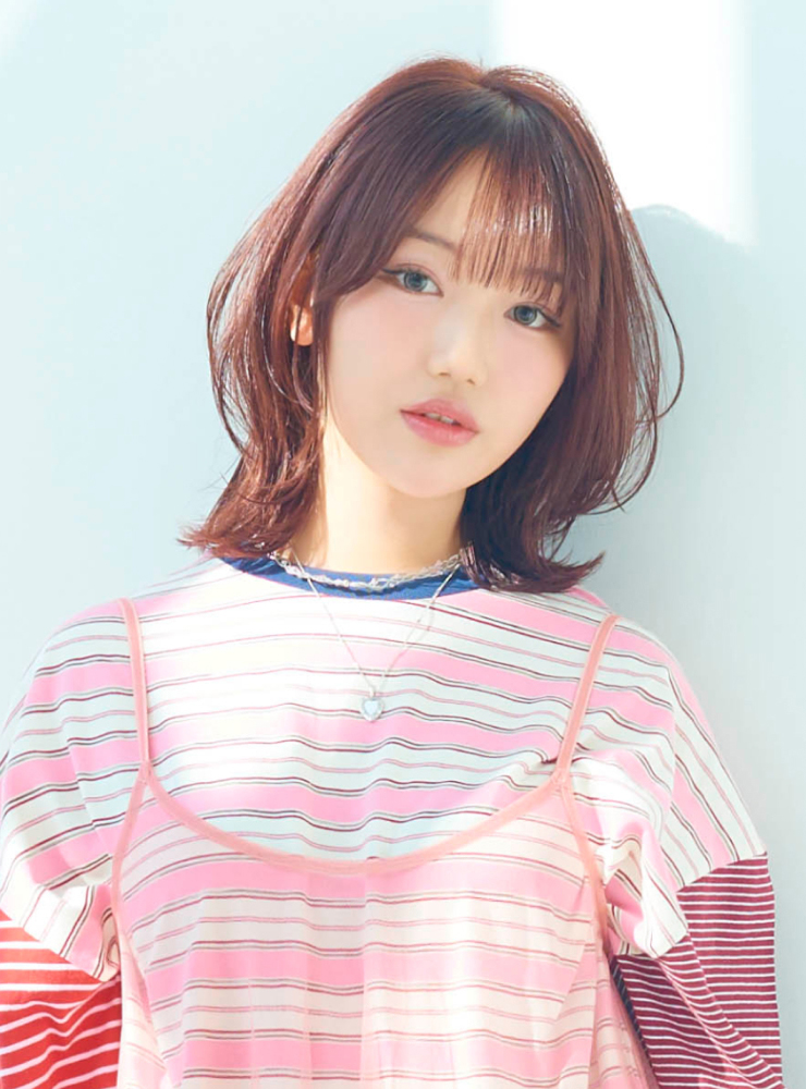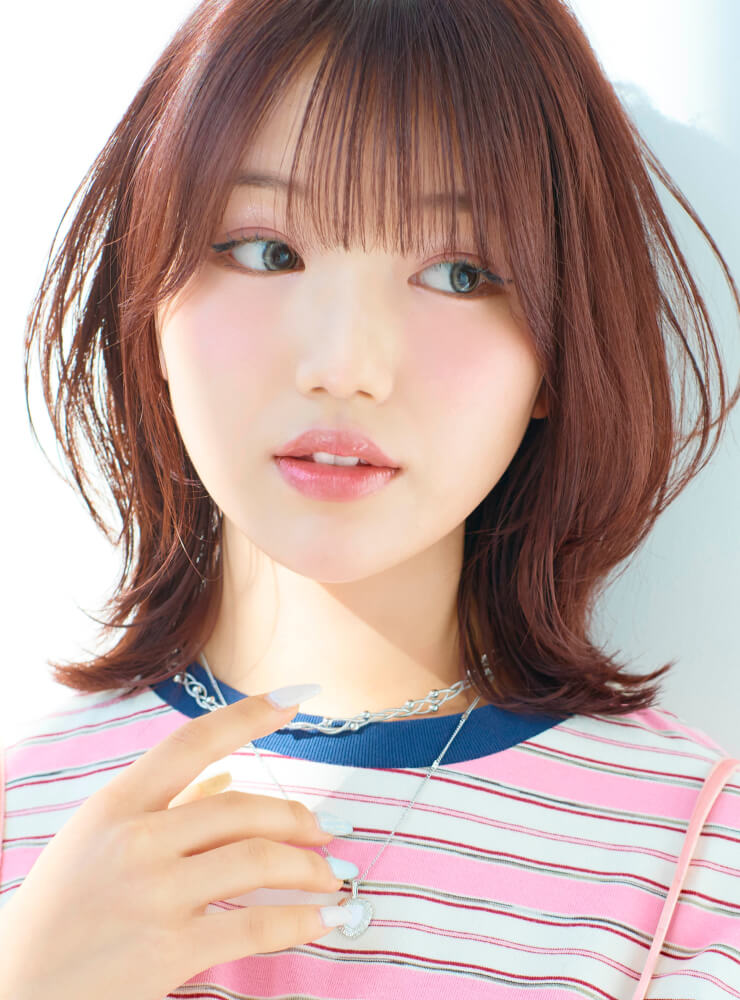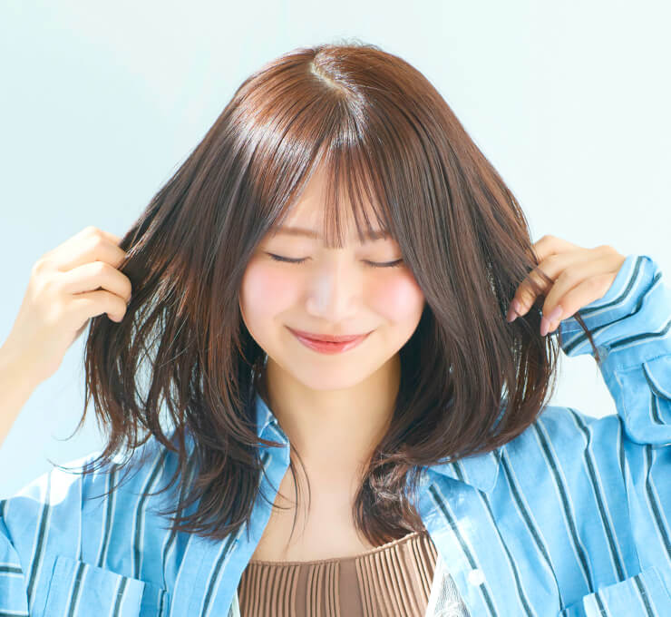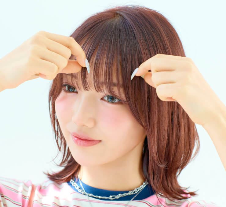 ストレートアイロンで毛先は外ハネ、表面は内巻きにしてやわらかな動きを表現。仕上げに「N. ポリッシュオイル」と「N. SHEAオイル」を少量混ぜてなじませ、内側から手ぐしを通して全体に広げる。前髪を指先でつまみ、軽やかな束感をつくる。