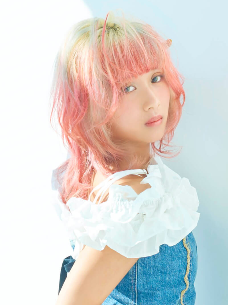 ブロンドベースを活かしたデザインカラーを楽しみたい人におすすめ。ピンクオレンジとターコイズのコントラストが際立つカラーは、レイヤースタイルとも相性抜群。人と少し違うヘアカラーに挑戦したい方にも。