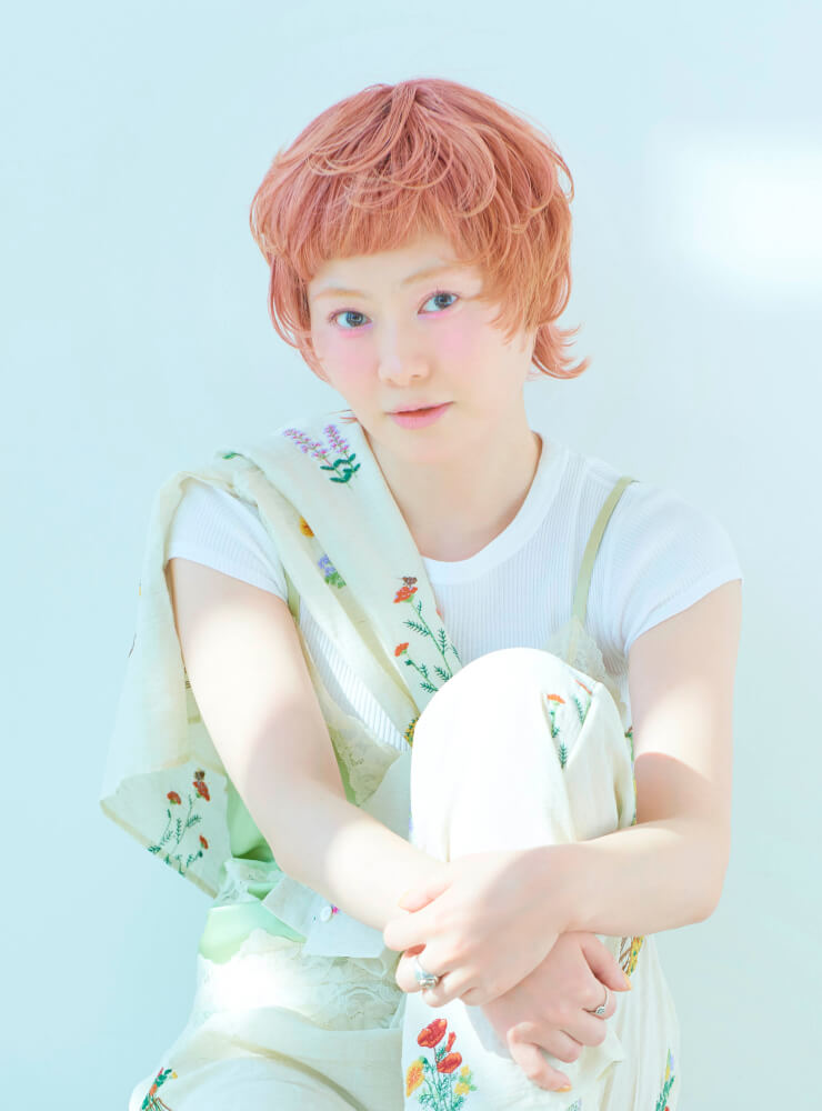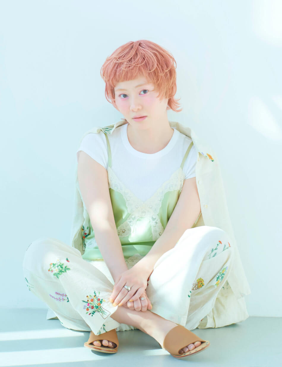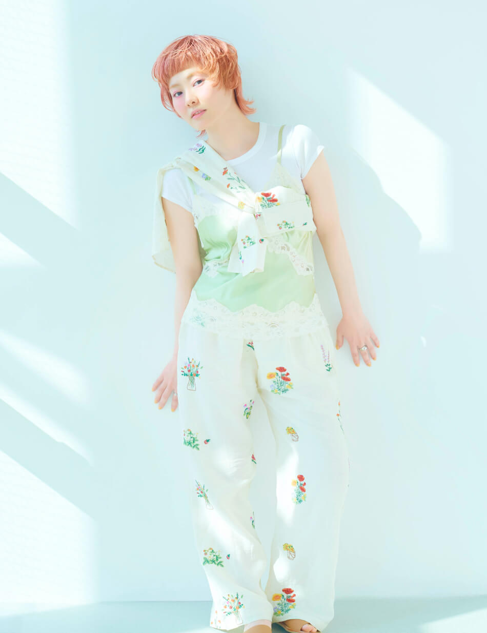 サテンのキャミソールと花柄刺繍のセットアップを主役にしたリラックススタイル。ランジェリーライクなデザインが、ショートヘアに女性らしさを添える。淡いピンクのヘアカラーに、パステルグリーンを差し色に。全体をやわらかなトーンでまとめつつ、サテンのツヤで上品な印象をUP。足元はヌーディーなサンダルで、軽やかな抜け感を演出。