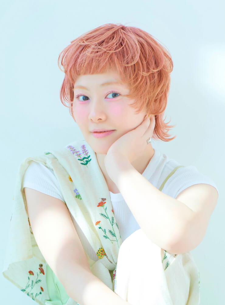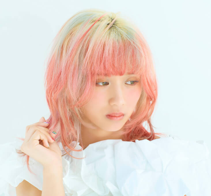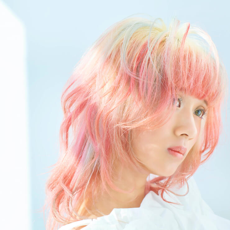 高彩度のスカーレットにピンクのニュアンスを重ねたピンクオレンジが主役のデザインカラー。根元はブロンドを残し、毛先に鮮やかな色味を重ねることで軽やかなコントラストを演出。さらにターコイズを差し色に加えることで、色同士のコントラストが際立つ印象的な仕上がりに。