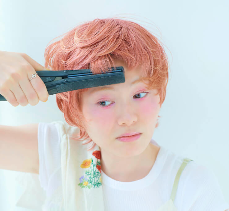 ストレートアイロンで毛先を内巻きに整え、襟足のみ外ハネにして軽やかな動きをメイク。仕上げにオイルを1滴、襟足から揉み込んでなじませ、毛先をつまんで束感をつくれば自然な立体感に。