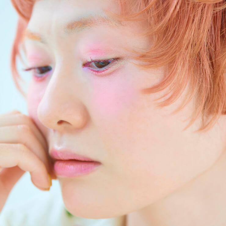 髪色に合わせてピンクを主役にした春メイク。黒目の上下に濃いピンクをのせて、目元の縦幅を強調。さらに目頭や目尻に黄緑のラメを添えて軽やかなアクセントを。チークはピンクにラベンダーを重ね、やわらかな血色感に。リップは同系ピンクにグロスを重ねて、ぷるんとしたツヤを取り入れて。