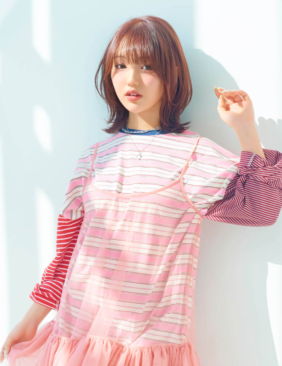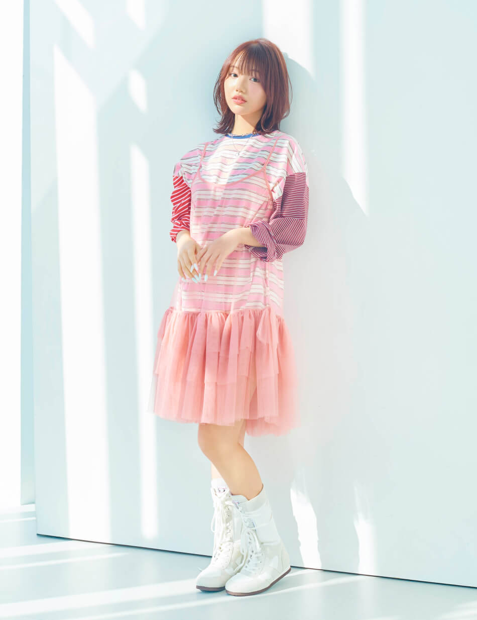 透け感のあるキャミワンピを、マルチボーダーのカットソーにレイヤードした旬のスタイル。ヘアカラーとリンクするピンクトーンでまとめながら、カジュアルなアイテムで抜け感を取り入れて。チュール素材の軽やかさも今季らしいバランス。淡い色の重なりが春らしいやわらかなムードを引き立てる。足元はボクサーブーツで引き締めて、甘さをほどよくセーブして。