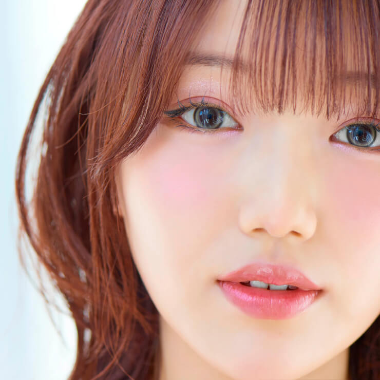ピンクを主役にしたやさしい印象のメイク。下まぶたの目頭にピンクラメを入れて光を集め、遠心顔を強調。マットピンクのチークを目の下からふんわりぼかし、中央にパールピンクを重ねて自然なツヤ感を。リップは粘膜系ピンクにブルー寄りのグロスを重ねて、ぷっくりとした仕上がりに。