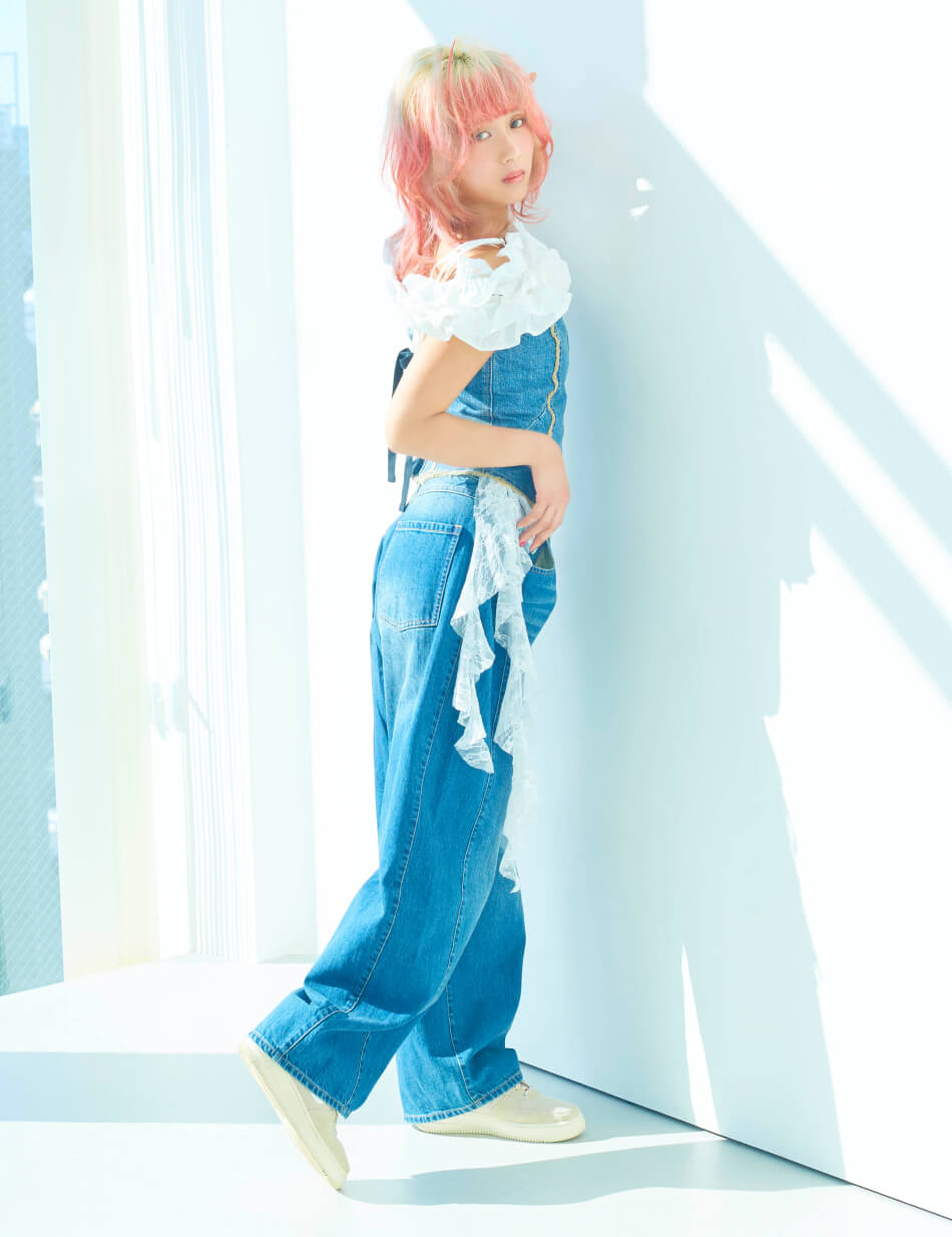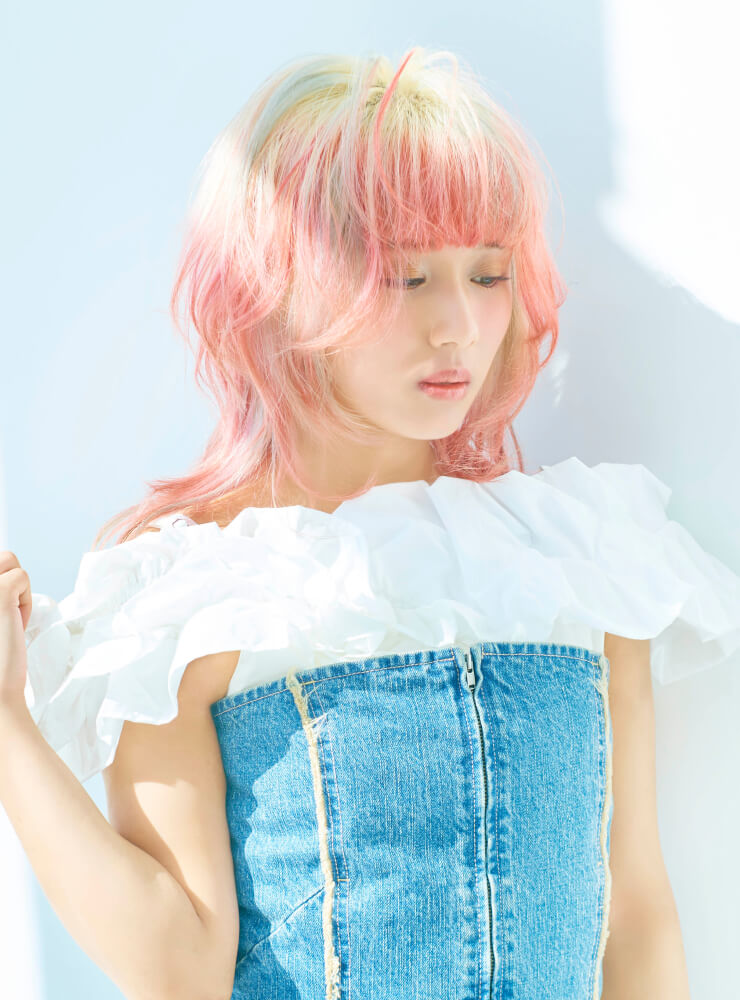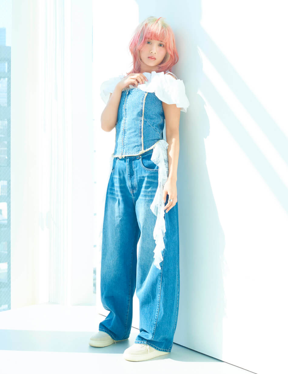 鮮やかなヘアカラーを引き立てるため、スタイリングはブルーデニムとホワイトを基調にシンプルに。コルセット風トップスでシルエットにメリハリをつけつつ、レースキャミソールのフリルをアクセントに。軽やかな素材感で、春夏らしい抜け感のあるスタイルに。デニムのラフさが、ビビッドな髪色を引き立てるバランスに。
