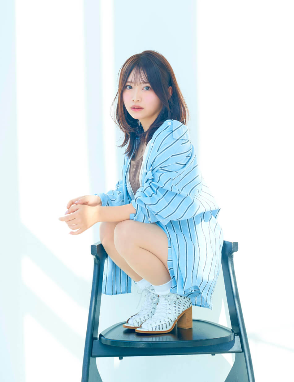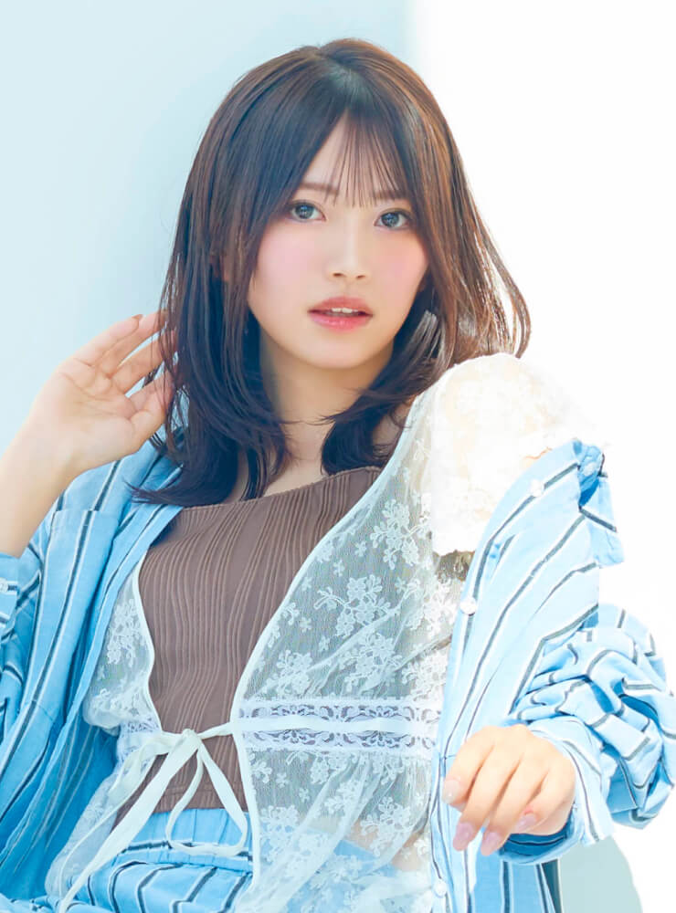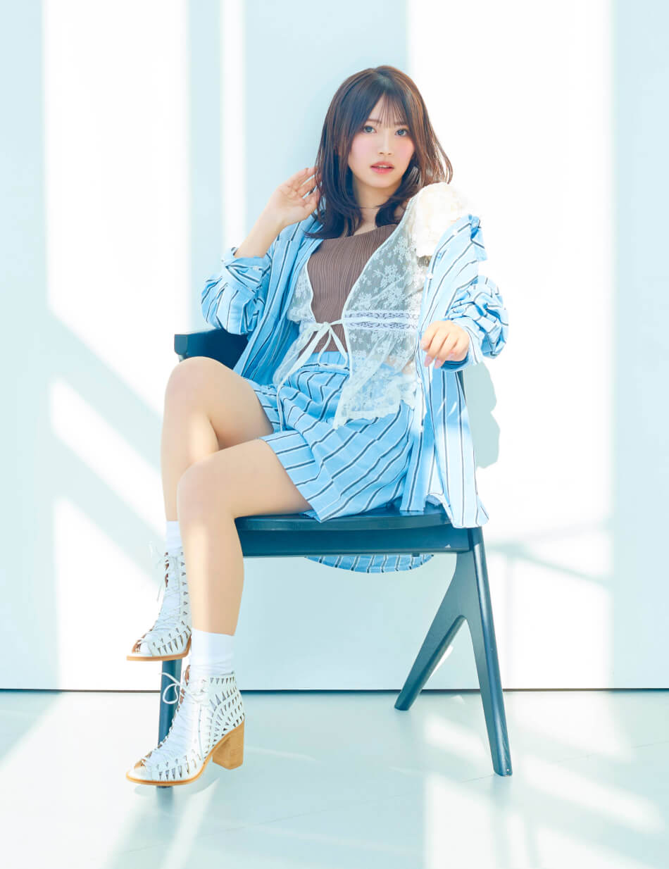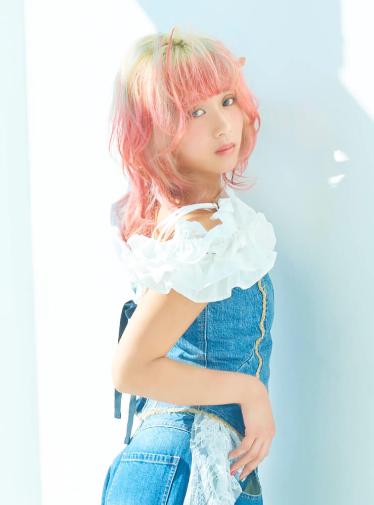 鮮やかなヘアカラーを引き立てるため、スタイリングはブルーデニムとホワイトを基調にシンプルに。コルセット風トップスでシルエットにメリハリをつけつつ、レースキャミソールのフリルをアクセントに。軽やかな素材感で、春夏らしい抜け感のあるスタイルに。デニムのラフさが、ビビッドな髪色を引き立てるバランスに。