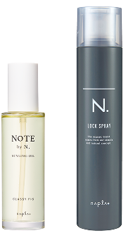 左から)植物オイルを配合し、髪の潤いとツヤをキープ。NOTE by N. スタイリングオイル クラッシィ フィグ 100ml ¥4400、狙った部分をしっかりホールド。N. オム ロックヘアスプレー 210g ¥1980(ともに美容室専売品)