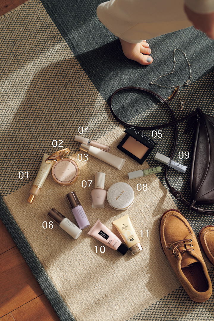 01_表情に合わせて自然なツヤが生まれるティントタイプのファンデーション。水分多めで軽やかにのびるので少量でOK。グッチ グロウ スキン ティント 全7色 各¥8470 02_重ねることで旬のブラーな質感になり、瞬時にシャレ顔に仕立ててくれるふんわりパウダー。保湿成分配合で乾燥くすみを防いでくれるのもいい。グッチ マット パウダー 全4色 各¥9570/ともにGUCCI beauty(グッチ ビューティ/コティジャパン) 03_はじけるようなみずみずしいテクスチャーを実現し、フレッシュな薄膜ツヤ肌を演出するブライトアップファンデーション。水分を抱え込むオイルや保湿成分がうるおいを与え続けて、透明感のある仕上がりが長続きする。スキンティント モイストヴェール SPF15・PA++ 25g ¥5280 04_欲しい部分に濡れツヤをONすることで、骨格を際立たせるリキッドタイプのハイライター。どんな肌色にもマッチするシャンパングロウ。グロウ イルミネーター 1.8g ¥3080[ともに3月6日発売]/ともにRMK(RMK Division) 05_サラサラの美ツヤ肌に欠かせないアイテムとして絶大な人気を誇る通称”リフ粉”から、より自然になじんで赤みをカバーするスキントーンタイプが誕生。NARS ライトリフレクティングセッティングパウダー プレスト N 05555 10g ¥6490[2月13日発売]/NARS(ナーズ ジャパン) 06_発酵の力を取り入れたセラムプライマー。沖縄生まれのアセロラを使用した「アセロラ発酵潤奏液™」など美容成分が肌をなめらかに整えながら、補色効果でくすみや色ムラなどの悩みもカバー。(左から)ザ・スキンウエイク 発酵液プライマー スムースカラーコントロール SPF42・PA++++ 真珠、藤 25ml 各¥4400/Koh Gen Do(こうげんどう) 07_透けるようなツヤ肌に仕立てるUVカットプライマーの小さいサイズが限定発売(00、01の2色)。トライアルにもぴったり。ポール&ジョー プロテクティング プライマー ハーフサイズ 00 SPF50+・PA++++ 15ml ¥2200[数量限定] 08_化粧下地とファンデーションの機能がひとつになったオールインワン・クッションコンパクトが、国内最高レベルのUVカット効果と皮脂プルーフ効果を搭載してリニューアル。ポール&ジョー プロテクティング ヴェール コンパクト SPF50+・PA++++ 全3色 ¥6050[ケースとセット価格]/ともにPAUL&JOE(ポール&ジョー ボーテ) 09_部分使いしやすいチップタイプの美容成分入りコントロールカラー。付けていないような自然な仕上がりが叶う。ミントグリーンは赤みやニキビ跡の補正に、ペールブルーは黄ぐすみを抑えて涼やか肌に。(左から)セラムカラーベース 720、721 各¥3740/bobe(ボウブ) 10_レッドとブルー、2種のパールがくすみや色ムラ、毛穴をカバーして自然にトーンアップ。高い保湿力で24時間乾燥知らず。アンリミテッド ブロック:ブースター アドバンスト エナジー フラッシュ SPF50+・PA+++ 30ml ¥5830/Shu uemura(シュウ ウエムラ) 11_色の効果で肌悩みに対応する色補正メイク下地。イエローはくすみや色ムラを整えてナチュラル美肌に。エレガンス モデリング カラーベース UV YE441 SPF40・PA+++・UV耐水性★ 30g ¥5500[2月17日発売]/Elégance(エレガンス コスメティックス お客様相談室) スウェットパンツ ¥25300/SLOANE(ザ ショップ スローン 新静岡セノバ店)、バッグ ¥26400/Archivepke(アーカイブエプク)、シューズ ¥58300/QUODDY(メイデン・カンパニー)、その他/スタイリスト私物