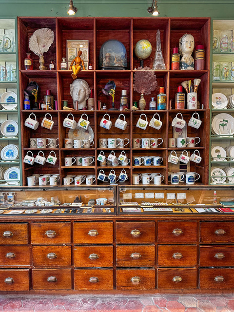 パリを象徴する水彩画のイラスト入りの商品とアンティークがミックスされてディスプレイがずらり。気に入ったアートピースを買ったなら、日常がカラフルに彩られること間違いなしです。
