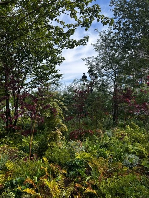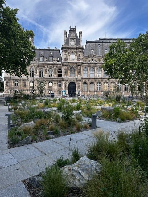 完成日の6月21日、朝パリ市庁舎に向かい散歩しましたが、さまざまな木が植えられオアシスのような空間が出来上がっていました。夏場の気温を下げる効果、トンボなどの昆虫が訪れ自然環境の再構築の進行などあるようです。