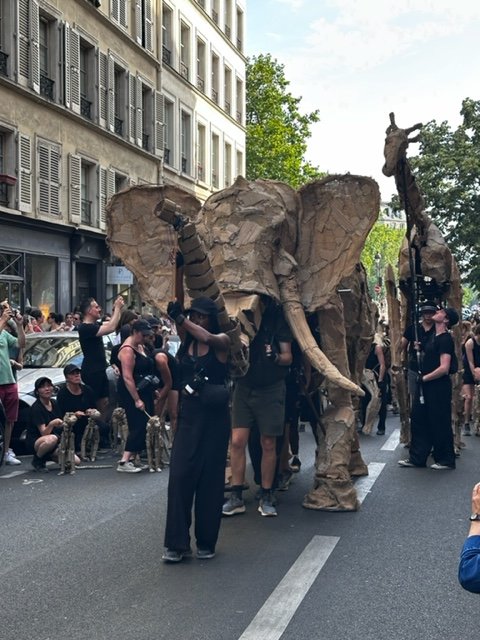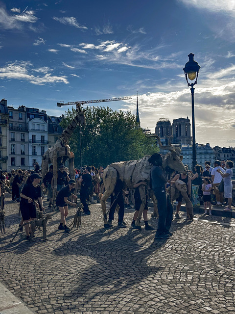 34度の灼熱の中、ルイ・フィリップ橋から現れたのは動物の人形を動かすアートパフォーマンス。