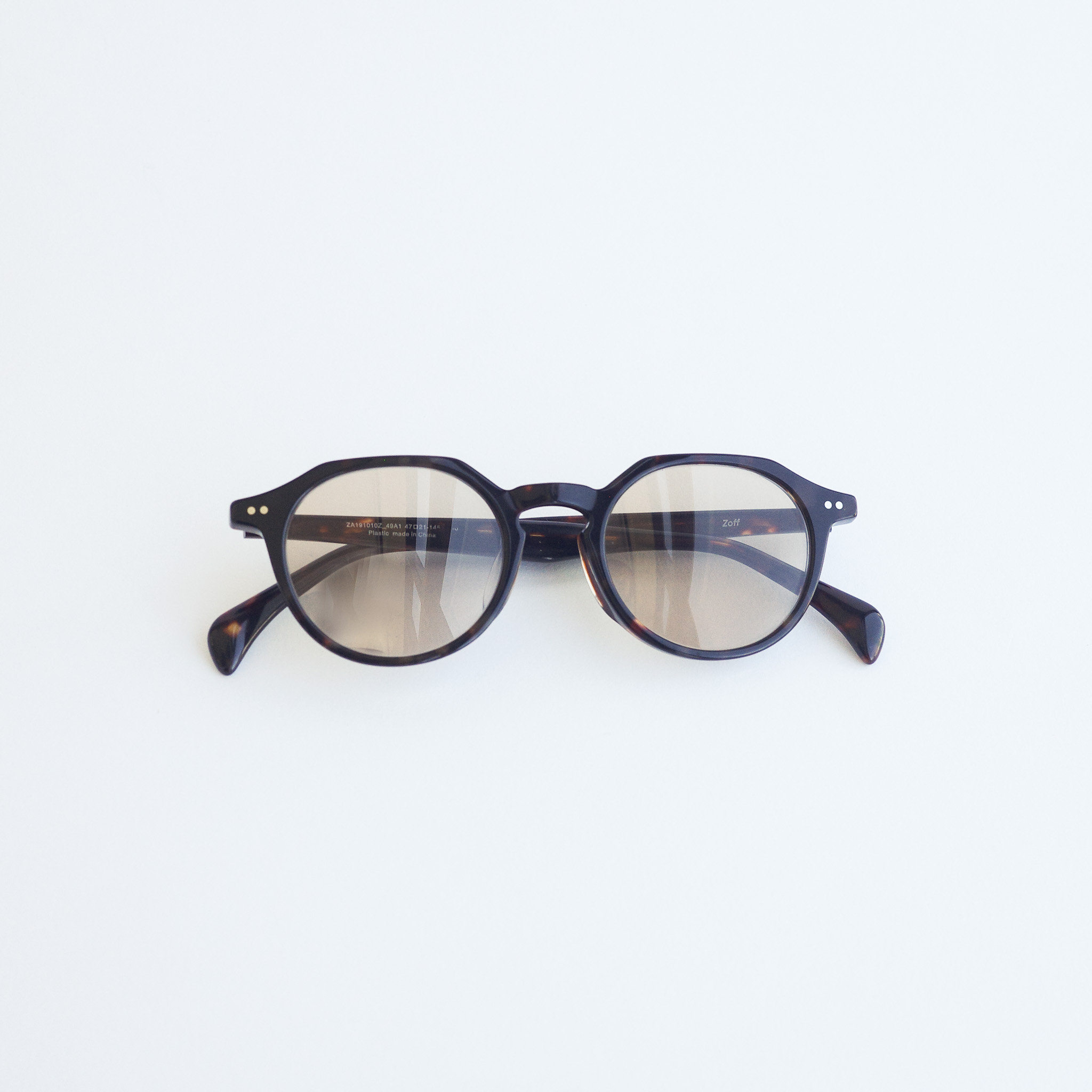 上から、一見メガネのように見えるこちらは《Zoff(ゾフ)》の調光サングラス。最近よく見かけるようになった調光レンズですが、紫外線の量でレンズの色の濃度が変わるので、室内ではいつも通りメガネのようにかけられるのが嬉しい!かけたり外したりしなくてもいいのも楽ですね。ゾフは調光レンズのカラーバリエーションがとにかく豊富で、取り入れやすい価格帯なのでデビューにもぴったり。繊細なべっこう柄のメタルフレームでどんなスタイルにも似合いますが、私的にはちょっと甘めのブラウスと合わせてクラシカルにかけたい気分。