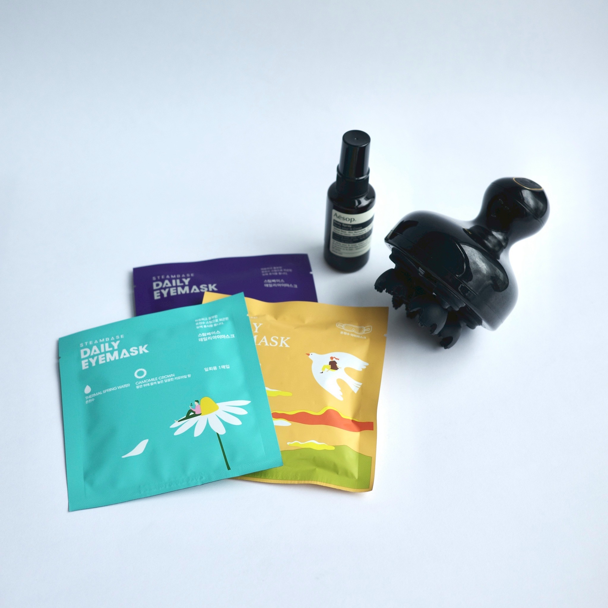 MYTREXの電気針ヘッドスパはほんとおすすめ!「頭皮ケア」「リフトケア」「フェイスケア」「ボディケア」がこのひとつで完結!お風呂でも使えるし、慢性的に肩こり&眼精疲労なので首や頭をモミモミするだけでスッキリ!これをするだけで、ほんと睡眠の質は変わります。EMSと強さをそれぞれ調整できるのも優秀。そして眼精疲労の人には欠かせない、アイマスク。韓国で購入したもので、パッケージやマスク自体もかわいいので気分をあげたいとき用。そして寝る前に香りで気分転換したいときに、おすすめなイソップのボディスプレー。シュッと枕に吹きかけて、その香りに包まれて眠りにつくと心地よくてぐっすり眠れます。このヒーローたちのおかけで、私の睡眠の質は格段にあがってる気がしてます。