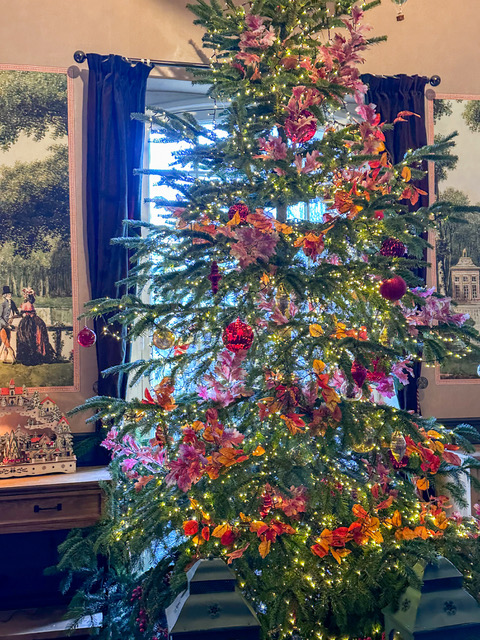 ベロアのリボンを飾っているのはよく見ますが、こちらはスカーフをリボンにしてツリーをデコレーション。可愛い!