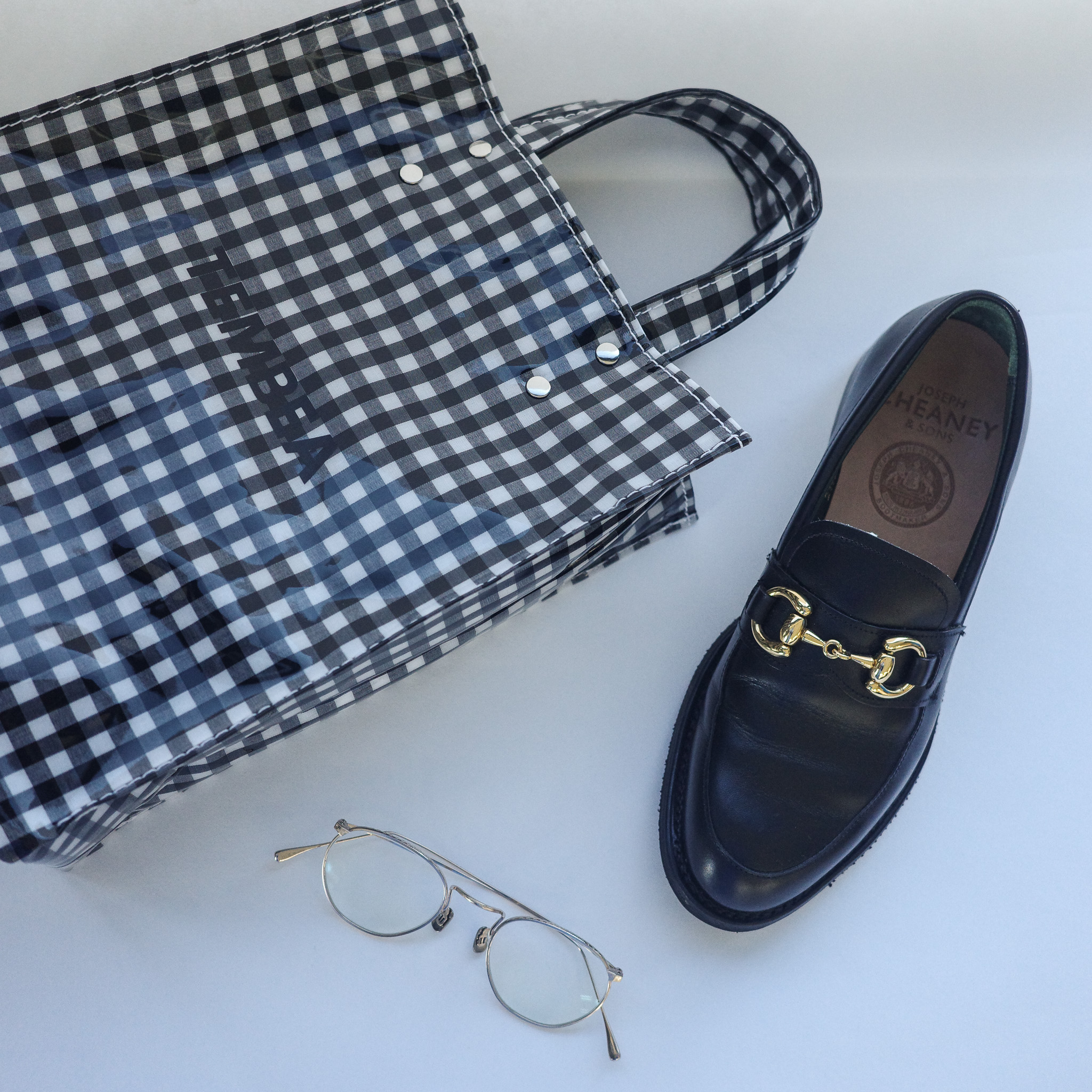 《JOSEPH CHEANEY(ジョセフ チーニー)》のビットローファーは、カーフレザーにラバーソールですっごく履きやすくて、革靴で足先が痛くなっちゃう人にもおすすめ。これ履くだけで、大人な足下になって、年齢に見合った自分になれてる気がします(笑)。《EYEVAN 7285》のメガネは、裸眼なのでブルーライトカットのレンズを入れて。細いフレームと、あえてゴールドにしたのがお気に入り。テンベアはギンガムチェックに一目惚れして。小さいサイズにして、プライベート用。たまたま編集YANASEも同じ柄とサイズを買ったみたいなので、こんどお揃いで持ちたいです☆。